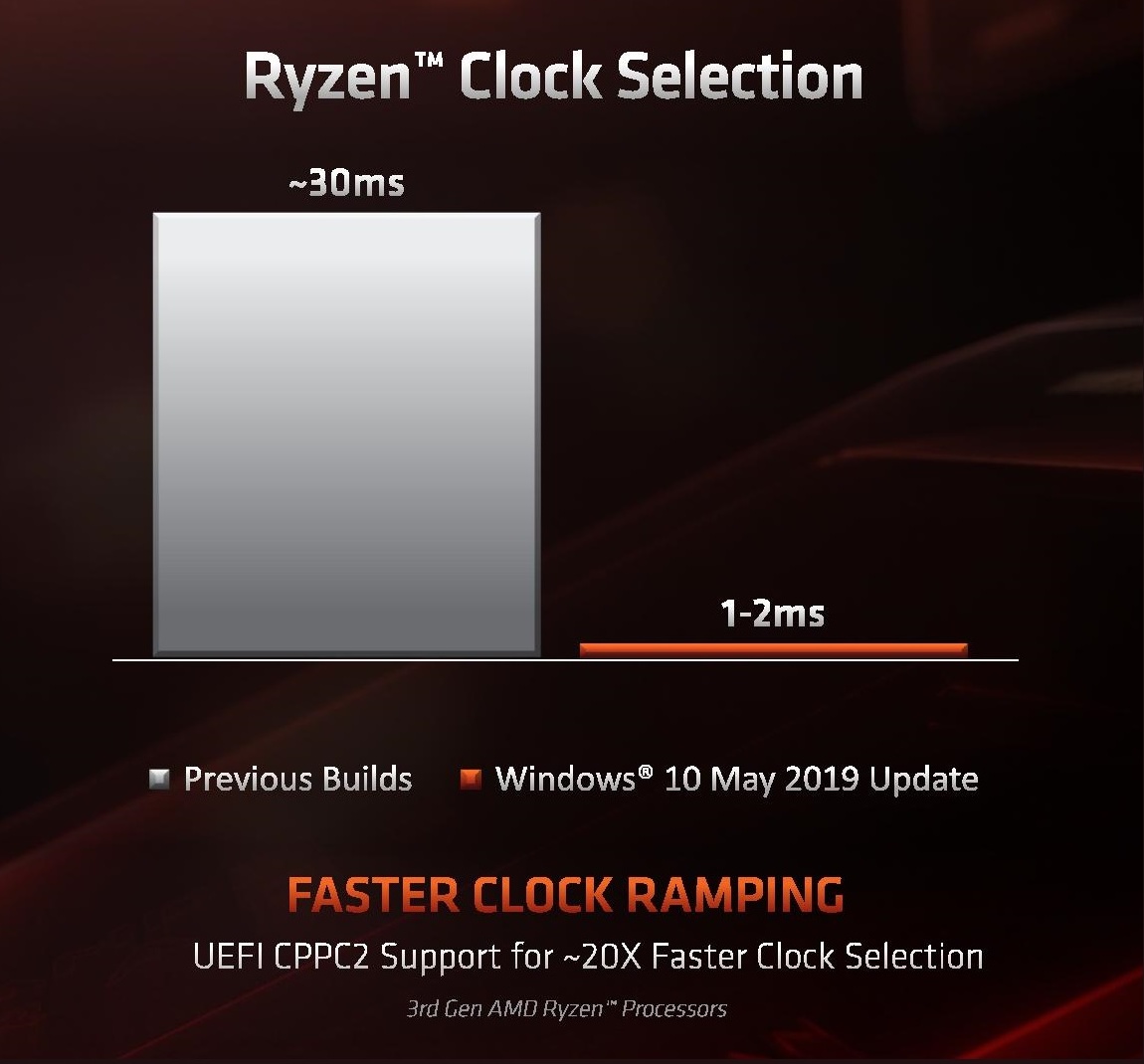 Secondo AMD, grazie all’update di Windows 19H1 “May 2019 Update” e all’aggiornamento dei BIOS delle schede di generazione precedente, con Zen 2 si passa da circa 30 millisecondi per effettuare questi “passaggi” di frequenza a solo 1-2 millisecondi. Ciò dovrebbe, sulla carta, rendere l’esperienza ben più reattiva di quanto si riscontra su Intel.