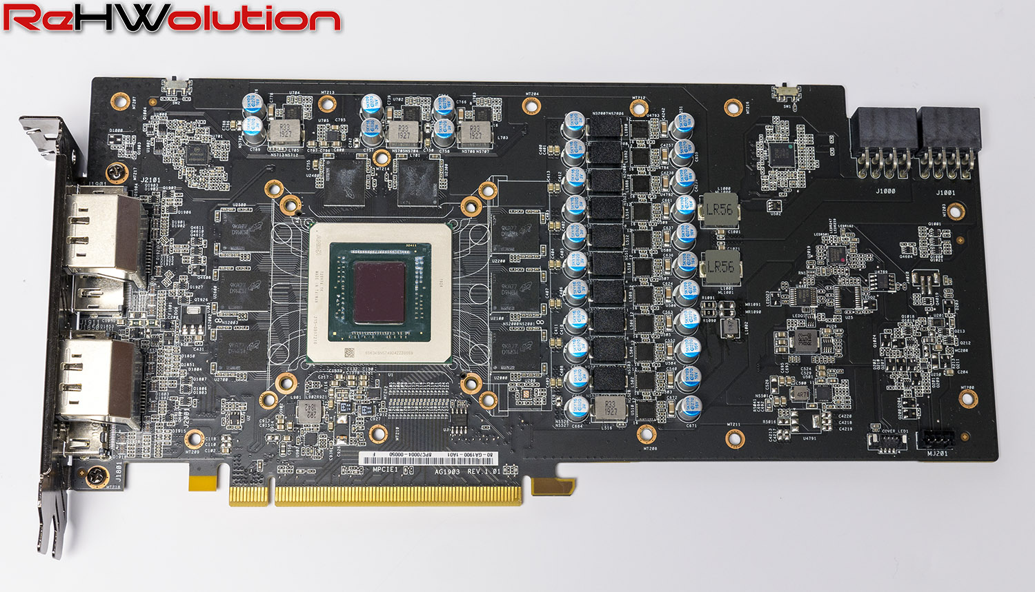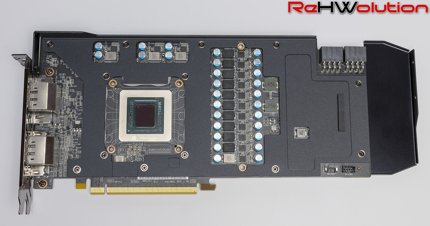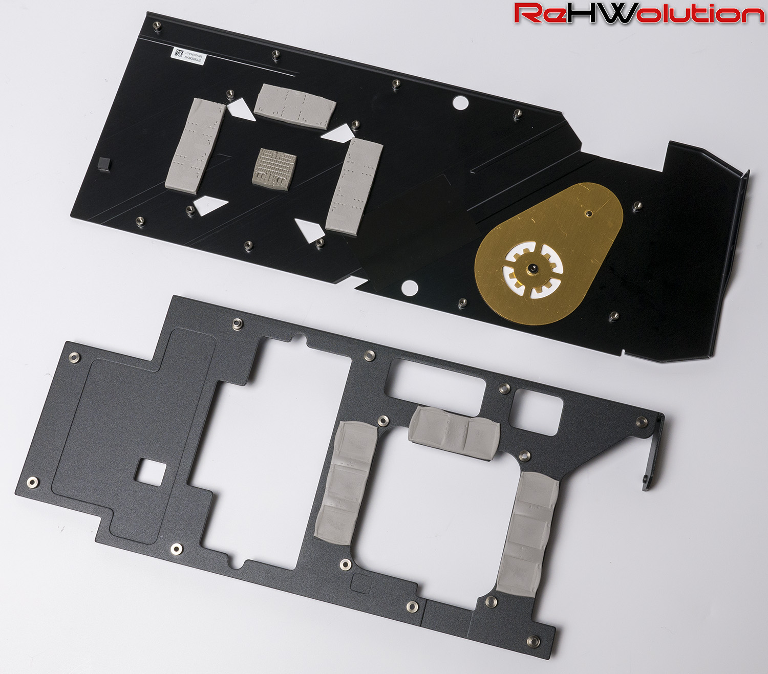 Anche su questa generazione di GPU, troviamo la tecnologia 0 dB, che spegne le ventole sotto una determinata temperatura, e il corposo dissipatore triventola è accompagnato da una backplate metallica sul retro della scheda, che contribuisce ulteriormente alla rigidità di essa, riducendo leggermente il “sag” e assistendo la dissipazione del calore tramite dei pad termici installati tra il PCB e la backplate stessa.