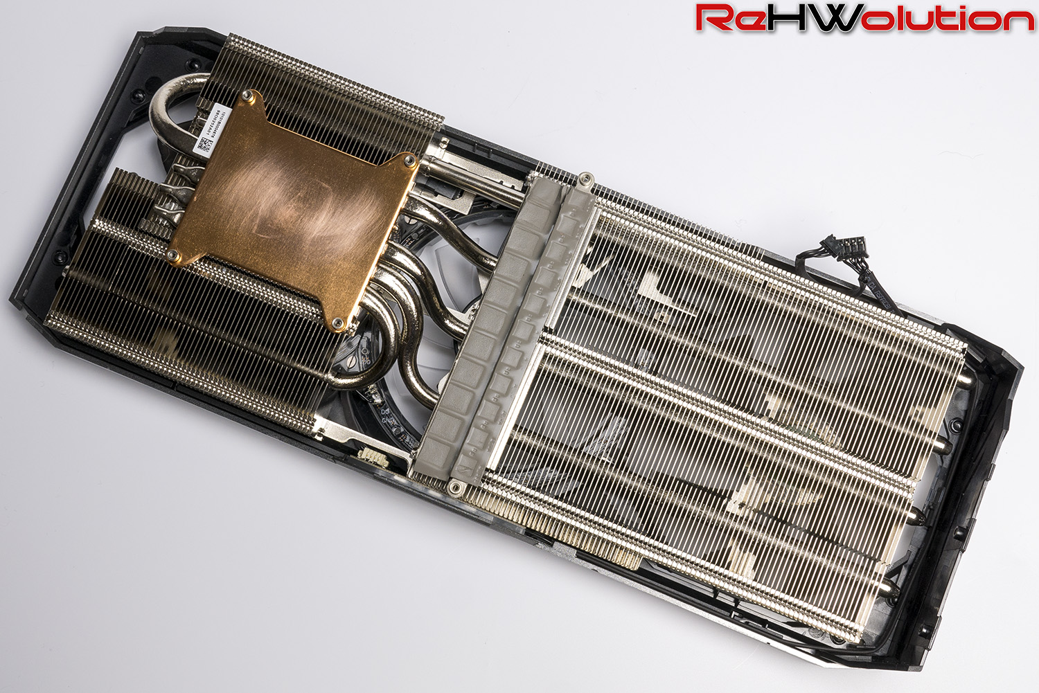 La base in rame è collegata alle alette in alluminio, trasversali rispetto alla lunghezza della scheda, tramite 5 heatpipes, e il tutto è raffreddato da 3 ventole, due da 90 mm ed una da 80 mm, portando la lunghezza totale a ben 32 centimetri e mezzo.