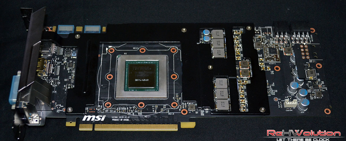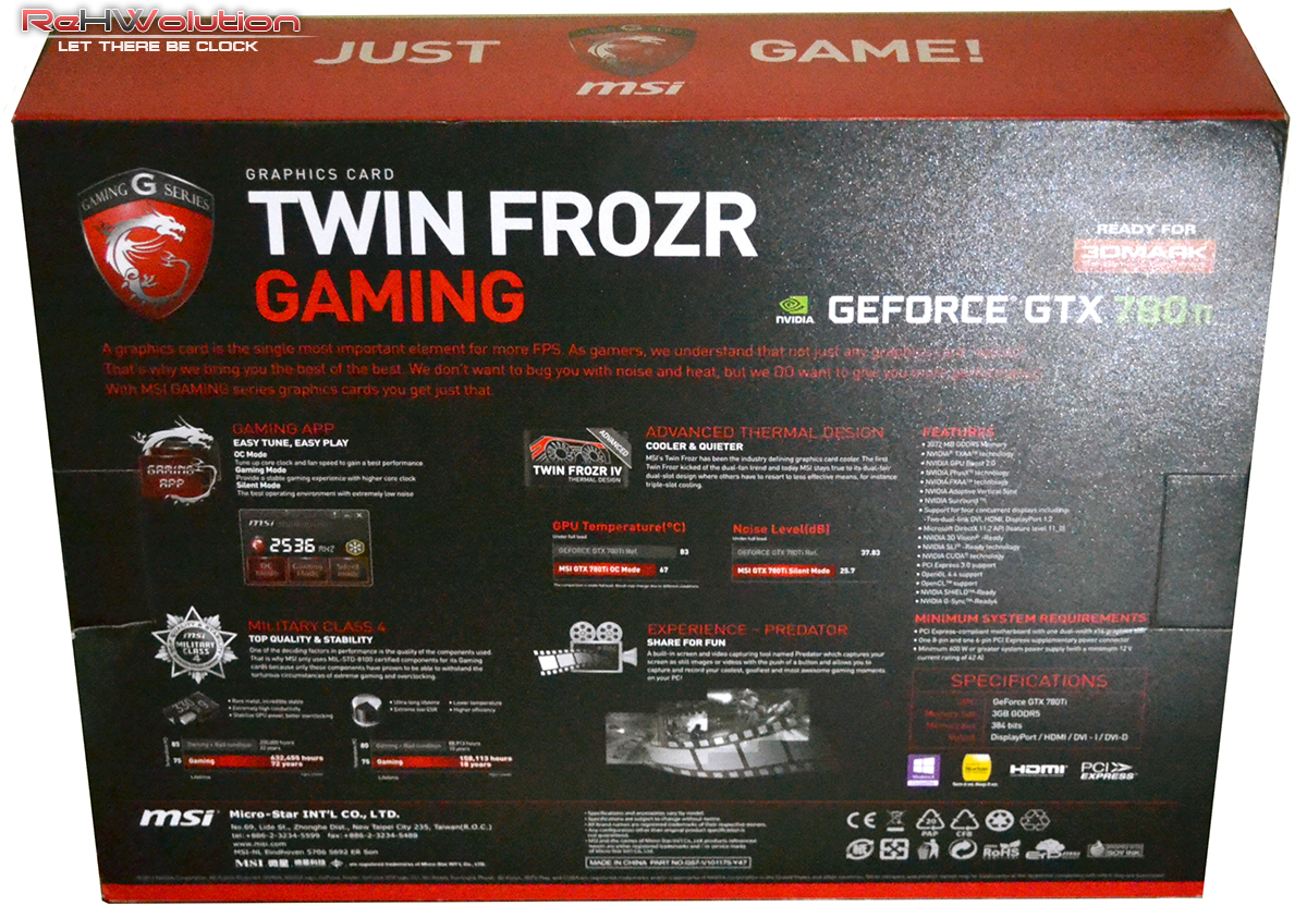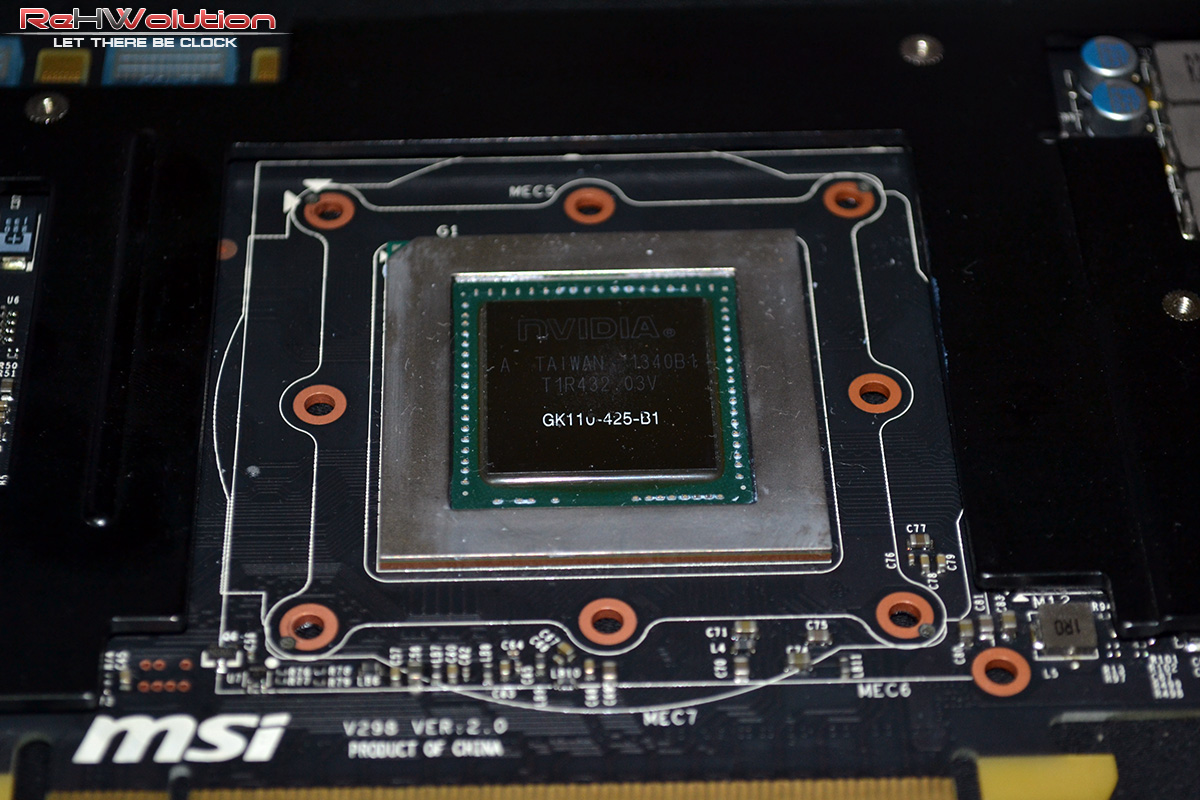 La MSI GeForce GTX780Ti Gaming è basata sul chip Kepler GK110-425-B1, stessa GPU che troviamo in differenti incarnazioni  su Titan, Titan Black e GTX 780. La scheda ha dei clock davvero elevati, figurandosi come la GPU più veloce dell’azienda e come la GPU più veloce da noi testata, con una frequenza del core di 1020 MHz (1085+ MHz in GPU Boost) e con le memorie a 1750 MHz (7 GHz in QDR). La VGA, facendo parte della linea gaming, presenta due features in particolare: la prima, è la possibilità di settare, tramite la Gaming APP, un profilo clock differente a seconda dell’occasione (Silent, Gaming, OC), la seconda è il Twin Frozr IV Advanced, sistema biventola di dissipazione del calore dotato di un radiatore di dimensioni generose, insieme a due ventole da 92 mm con tecnologia Dust Removal. Il PCB è quello reference, non apportando modifiche se non con una frontplate responsabile di raffreddare i chip di memoria e i Power MOS.