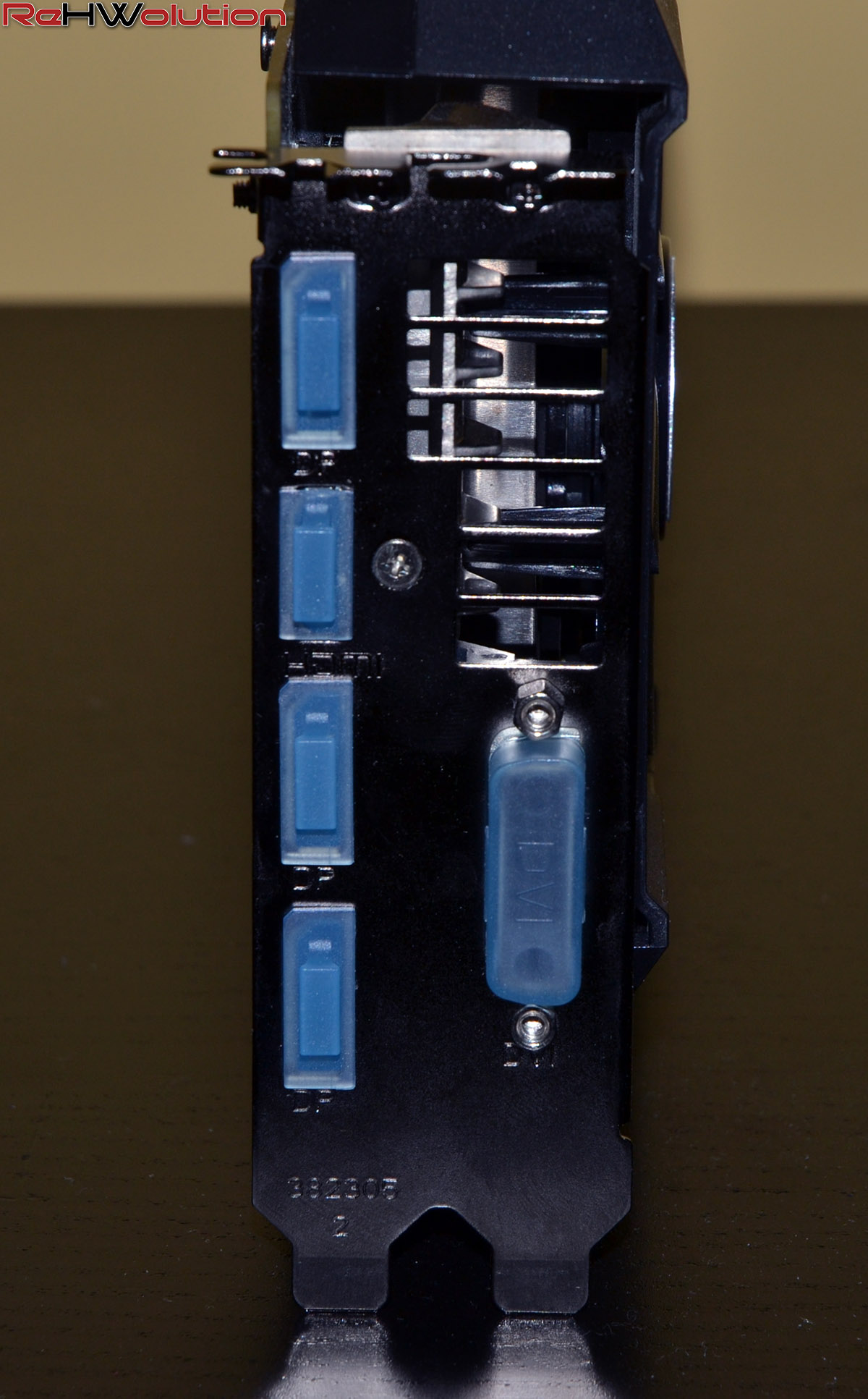 Il pannello di output è costituito da una porta DVI-D, una porta HDMI compatibile con lo standard 1.4a (consentendo quindi una risoluzione in 4K ma a soli 30 FPS) e 3 porte DisplayPort 1.2a, compatibili quindi sia con una risoluzione 4K a 60 FPS che con la tecnologia AMD FreeSync.