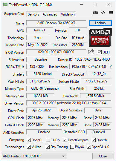 Di seguito discuteremo le specifiche tecniche della Sapphire NITRO+ Radeon RX 6950 XT 16G GDDR6. Per maggiori informazioni e i driver più aggiornati vi rimandiamo al sito ufficiale del produttore (Sapphire):