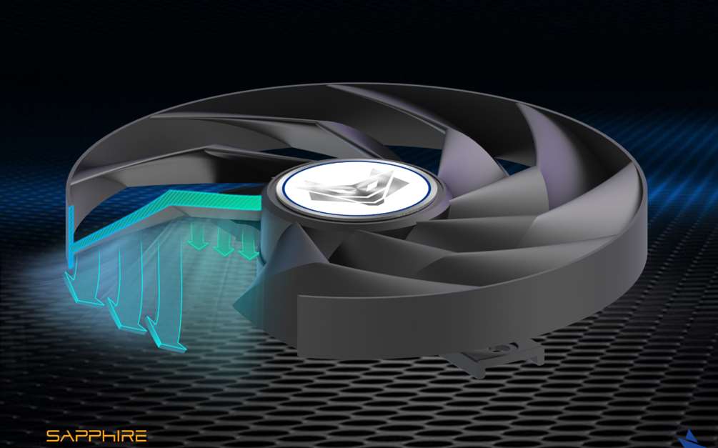 Il dissipatore presenta linee simili a quanto visto su altre schede, ma il design da quasi 4 slot (3.5 per essere precisi) è una novità su schede Sapphire, così come lo sono le nuove ventole utilizzate per questa NITRO+ PURE, che presentano una sezione a doppia curvatura che aumenta la pressione statica fino al 44% e la portata d’aria fino al 19% rispetto al design precedente.