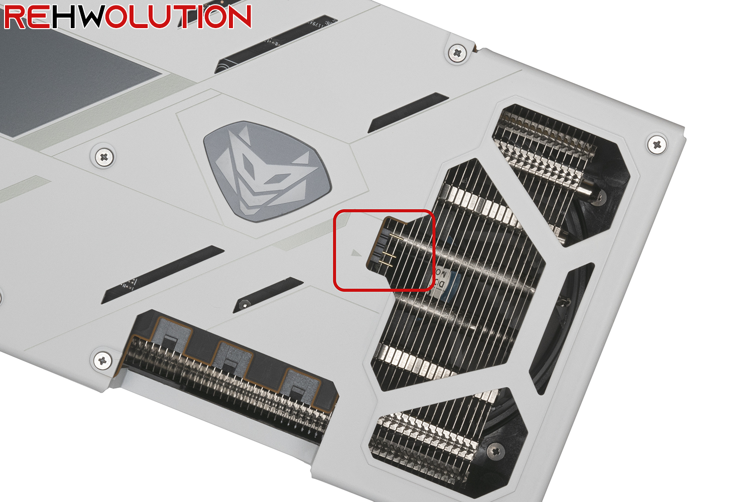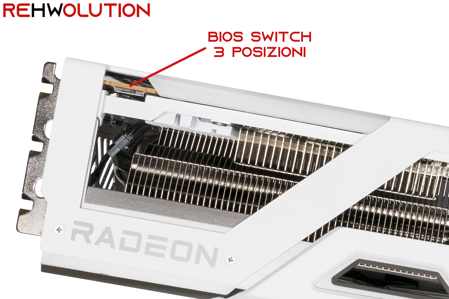 Sulla scheda è installato un selettore a 3 posizioni che consente di scegliere altrettante impostazioni di utilizzo: BIOS standard, BIOS OC e switch software, che consente all’utente di passare da un BIOS all’altro tramite TriXX. È presente inoltre un connettore ARGB (3 pin 5 volt) che consente di collegare la scheda video alla mainboard e gestire l’illuminazione tramite il software proprietario di quest’ultima, sincronizzando completamente gli effetti di luce di tutto il sistema.