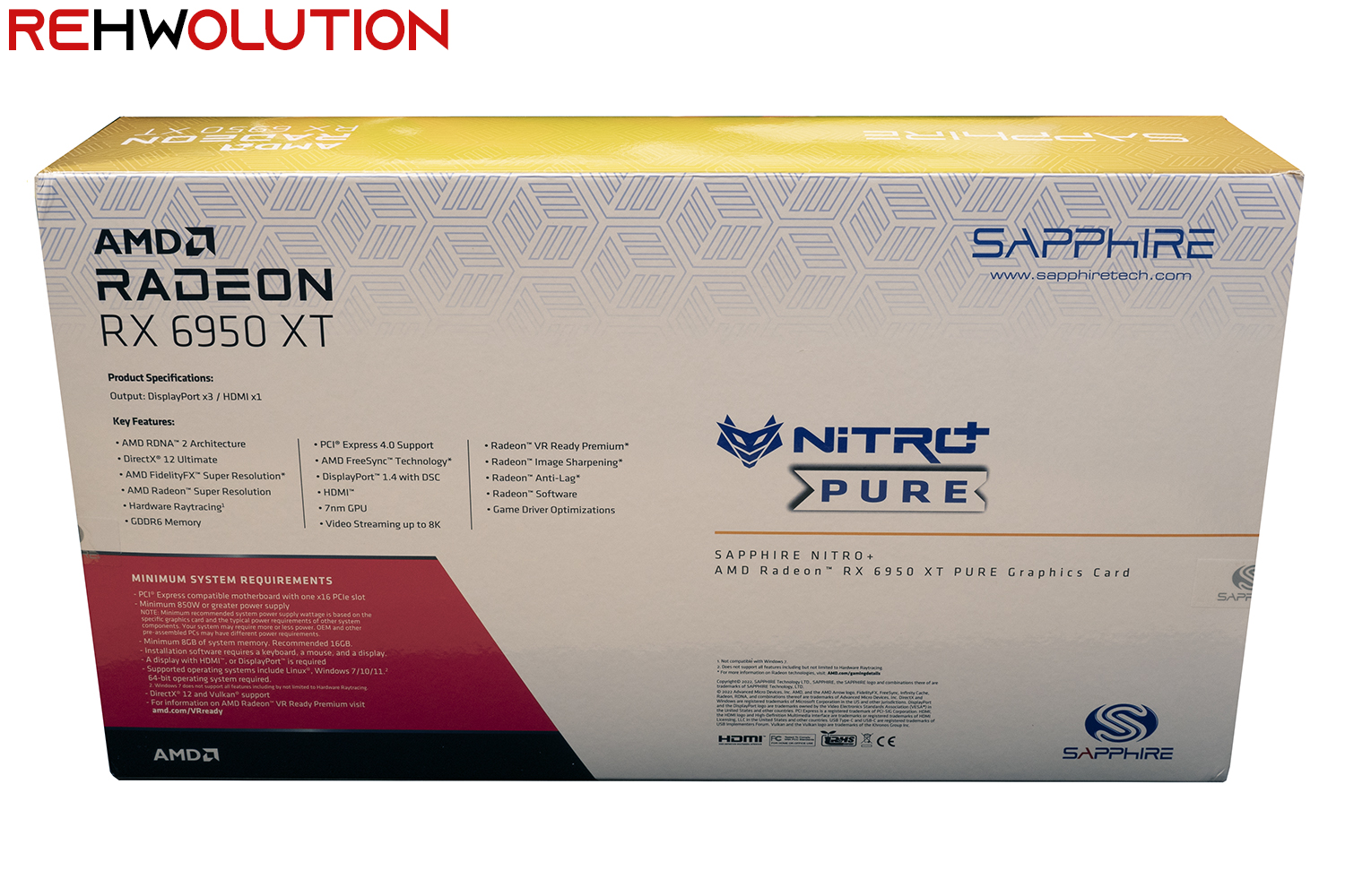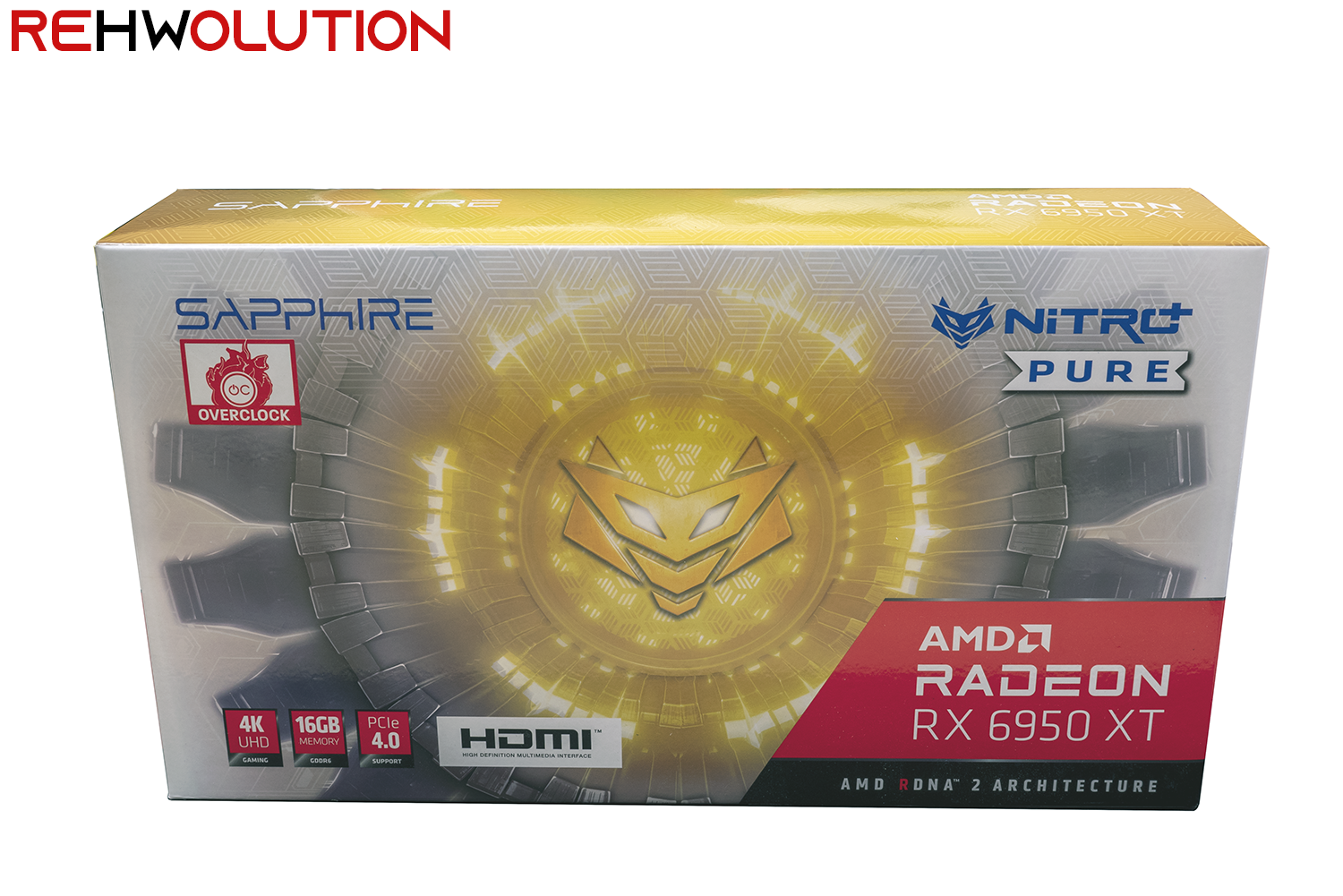 Il design della confezione richiama in tutto e per tutto quello delle altre schede appartenenti alla serie RX 6000 (e molto simili a quelle delle schede della serie RX 5000), con il logo NITRO+ al centro della grafica frontale. Alcune informazioni basilari come la quantità di memoria video (che è 16 GB), il supporto al bus PCIe 4.0 e la dicitura “4K UHD Gaming” vista la tanta potenza a disposizione, insieme ad uno sticker che riporta “OVERCLOCK”, viste le frequenze ben più spinte della NITRO+ e del modello reference.