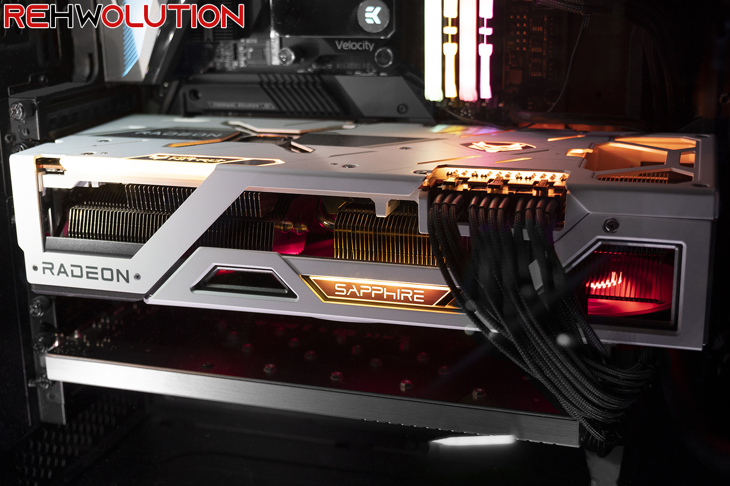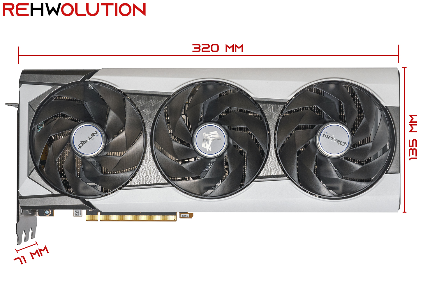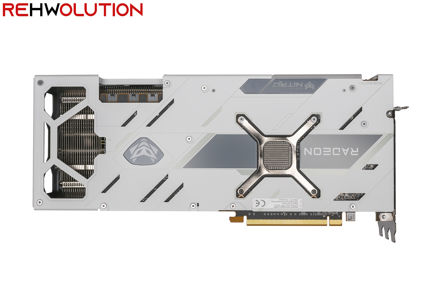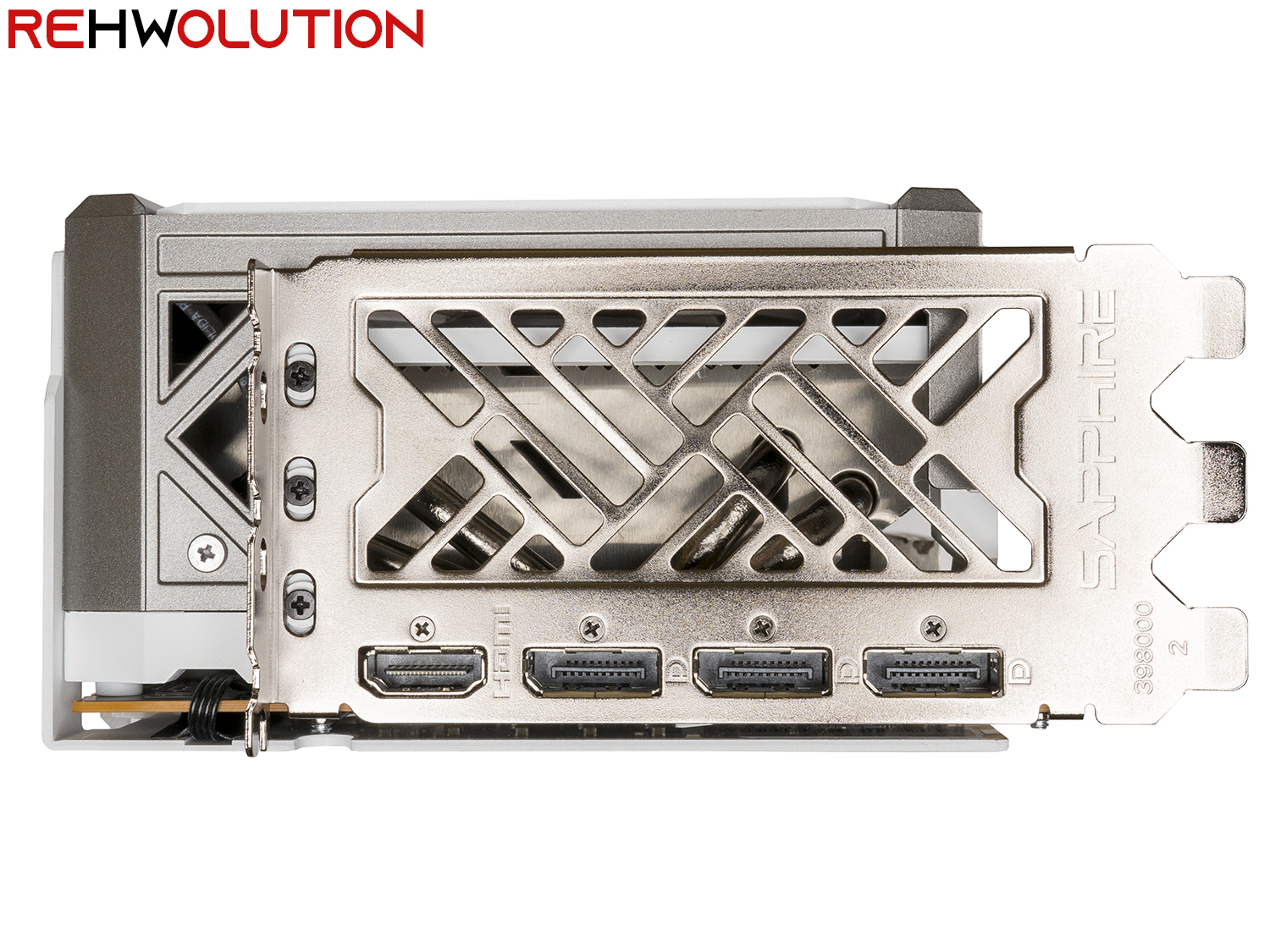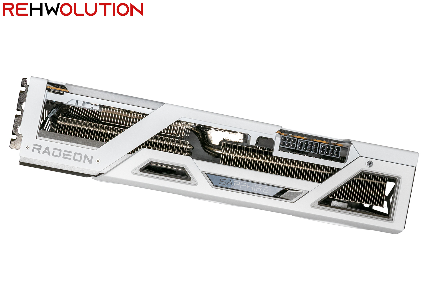 Anche la backplate è composta dello stesso materiale e presenta alcuni fori per il passaggio dell’aria spinta dalle ventole ed il collegamento dei connettori PEG di alimentazione, che in questo caso sono 2×8+1×6 pin. Come anticipato nelle pagine precedenti, questa è la prima scheda grafica di Sapphire a presentare un design da 3.5 slot, merito del sistema di dissipazione giustamente sproporzionato per mantenere temperature (e rumorosità) ai minimi livelli.