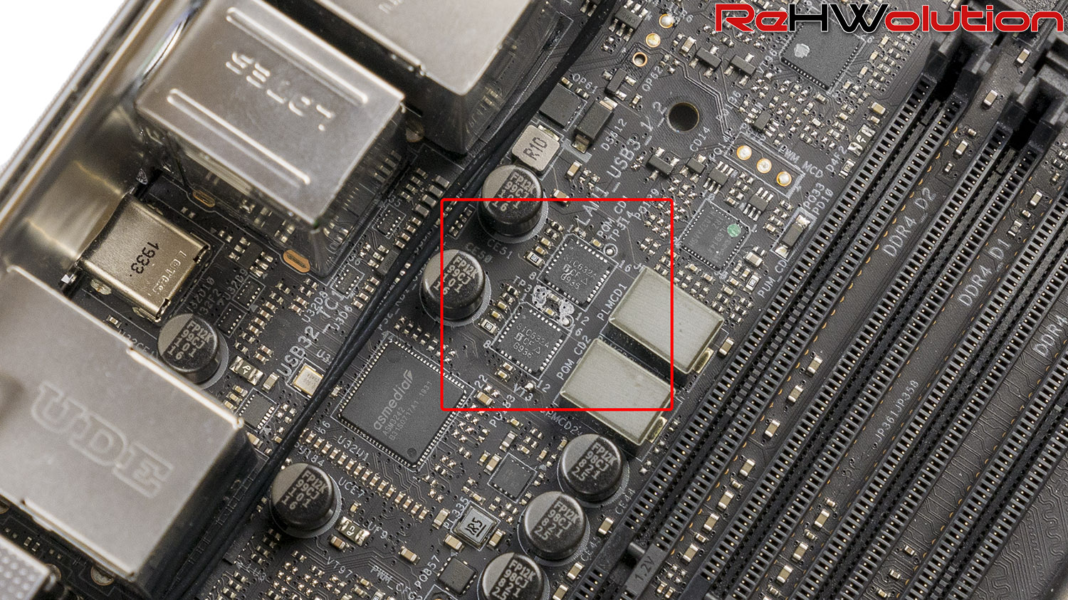 Con la capacità di erogare ben 1440 amperes, la sezione di alimentazione della TRX40 Taichi è la migliore sulla piattaforma HEDT (insieme a quella della Zenith II Extreme Alpha, che però non presenta doublers e ha disposto le fasi in configurazione di teaming), con un controller 8+0 Intersil ISL69247 che gestisce le 16 (8×2) fasi Intersil ISL99390 da ben 90 amperes ciascuna per il VCPU, mentre il VSOC è affidato a due identiche fasi. Il doubling è affidato ai tradizionali Intersil ISL6617A situati sul retro della scheda madre, e raffreddati dalla backplate tramite uno spesso pad termico.