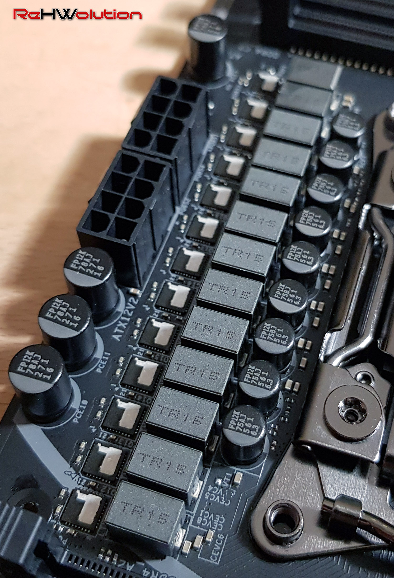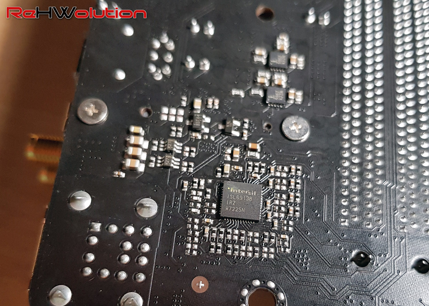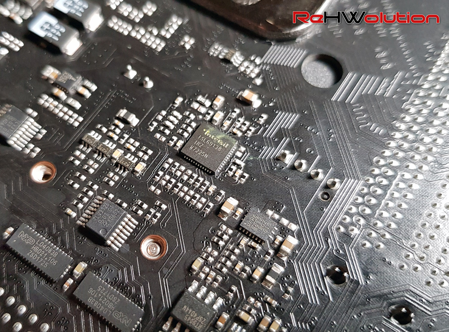 La sezione di alimentazione è composta da un sistema a 12+1 fasi, tutte Intersil ISL99227, capaci di erogare 60 A ciascuna, per un totale di 720 A, gestite da un controller Intersil ISL69138. Ovviamente, tale controller gestisce al massimo 8 fasi, quindi ci troviamo di fronte ad un sistema a fasi raddoppiate, con degli Intersil ISL6617 sul retro che, di fatto, rendono le fasi un sistema 6+1 raddoppiato. Le memorie hanno diversi VRM (Fairchild FDPC5030), 2 per ogni lato del socket per un totale di 100 A per tutti gli slot di memoria, e ogni coppia è gestita da un controller Intersil ISL99227 che ne gestisce anche la modulazione.