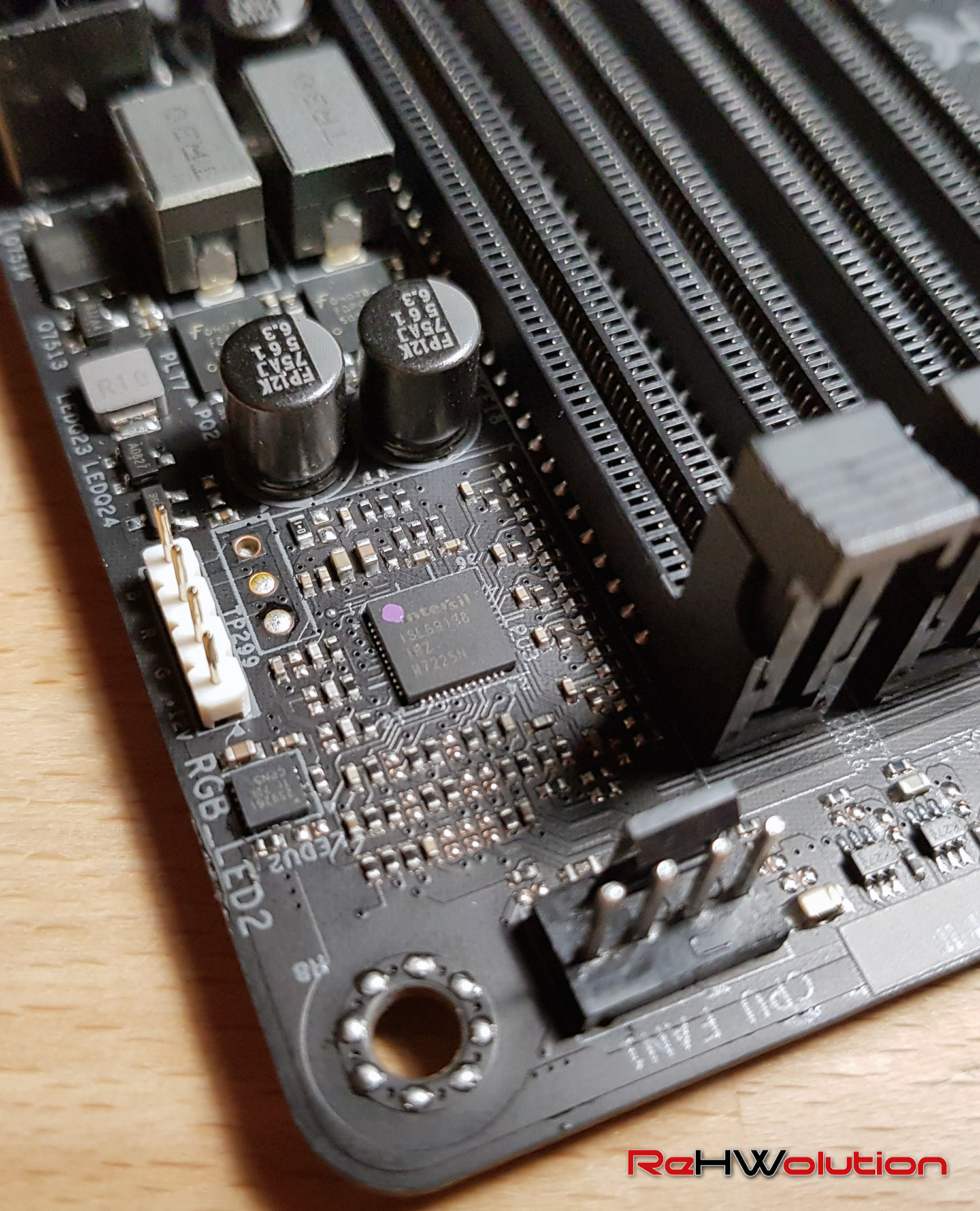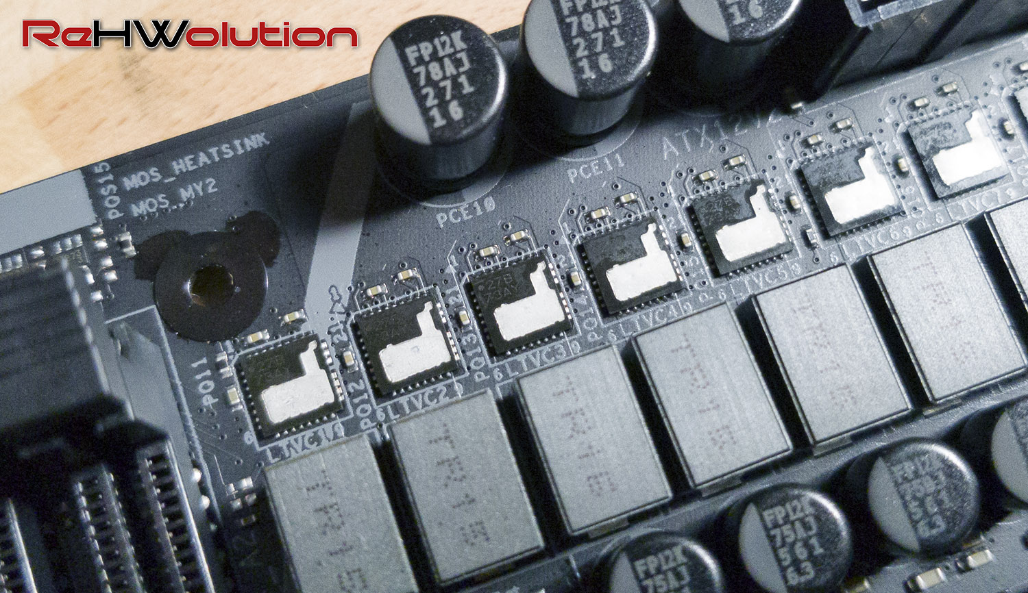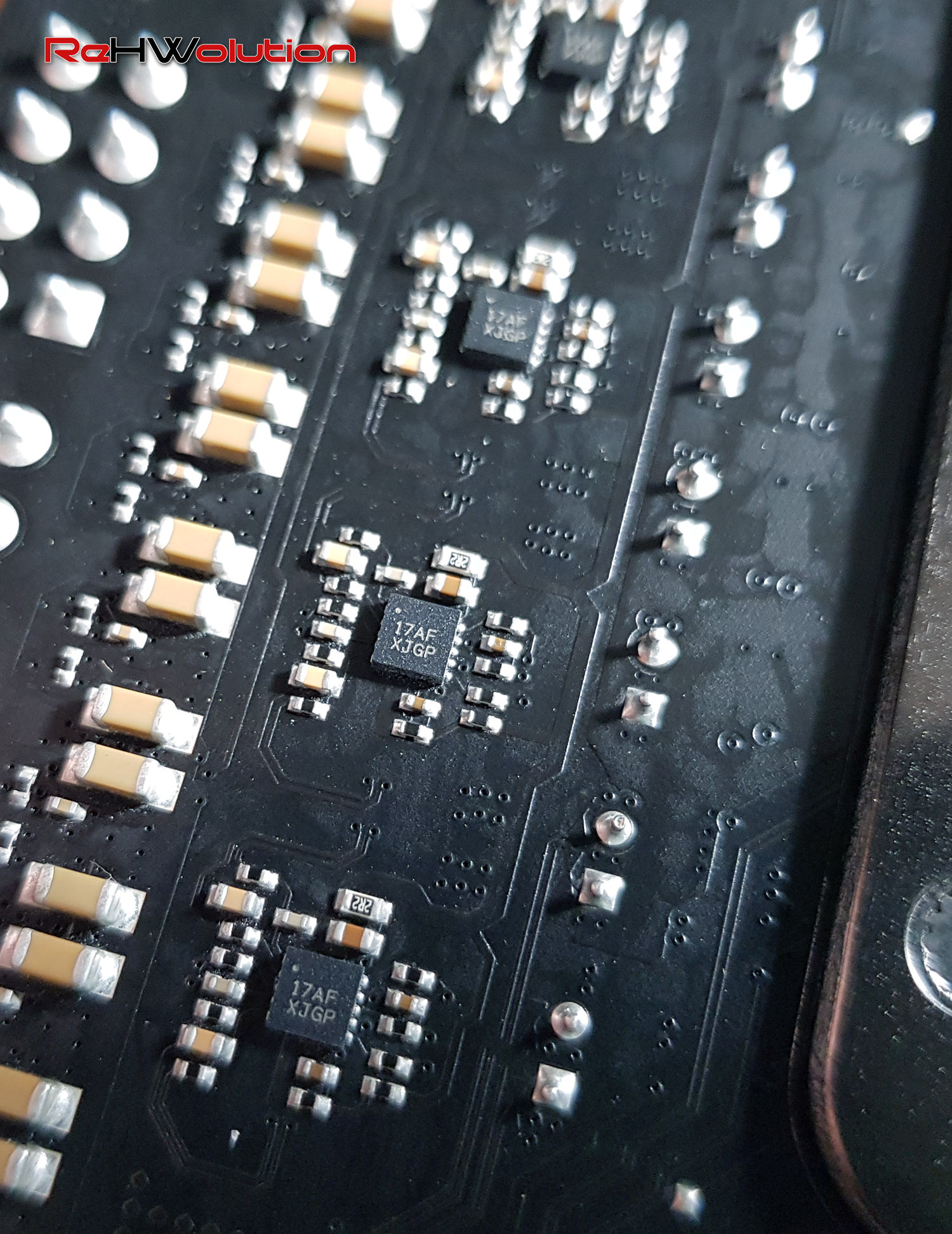 La sezione di alimentazione è composta da un sistema a 12+1 fasi, tutte Intersil ISL99227, capaci di erogare 60 A ciascuna, per un totale di 720 A, gestite da un controller Intersil ISL69138. Ovviamente, tale controller gestisce al massimo 8 fasi, quindi ci troviamo di fronte ad un sistema a fasi raddoppiate, con degli Intersil ISL6617 sul retro che, di fatto, rendono le fasi un sistema 6+1 raddoppiato. Le memorie hanno diversi VRM (Fairchild FDPC5030), 2 per ogni lato del socket per un totale di 100 A per tutti gli slot di memoria, e ogni coppia è gestita da un controller Intersil ISL99227 che ne gestisce anche la modulazione.