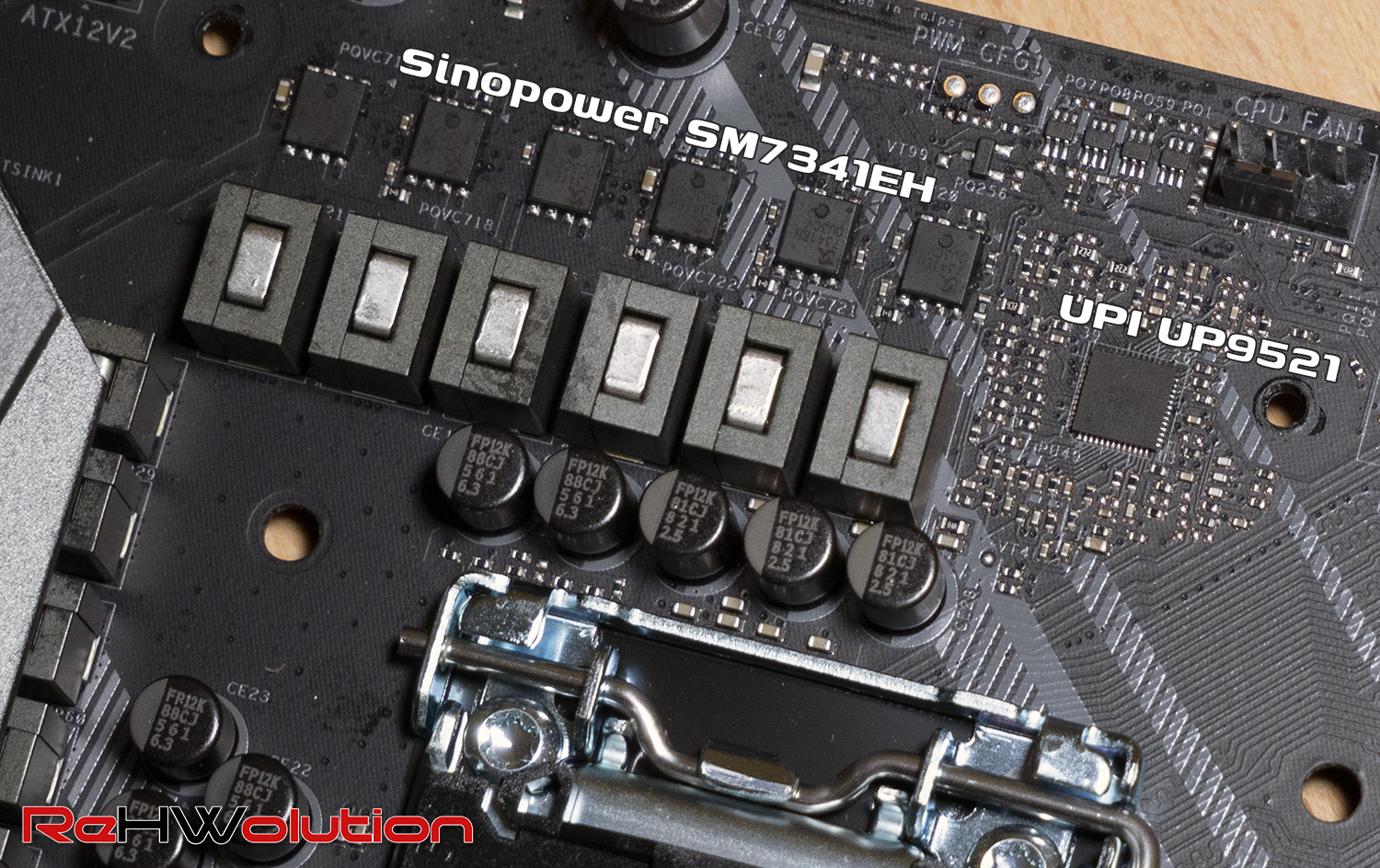 Sul fronte della sezione d’alimentazione, la scheda riporta 12+2 fasi installate, delle Sinopower SM7341EH, accoppiate a due a due tramite delle UPI uP1965P, quindi la scheda è da considerarsi una 6+1 fasi, con fasi in parallelo per un bilanciamento energetico migliore di una 6+1 fasi senza componenti in parallelo.