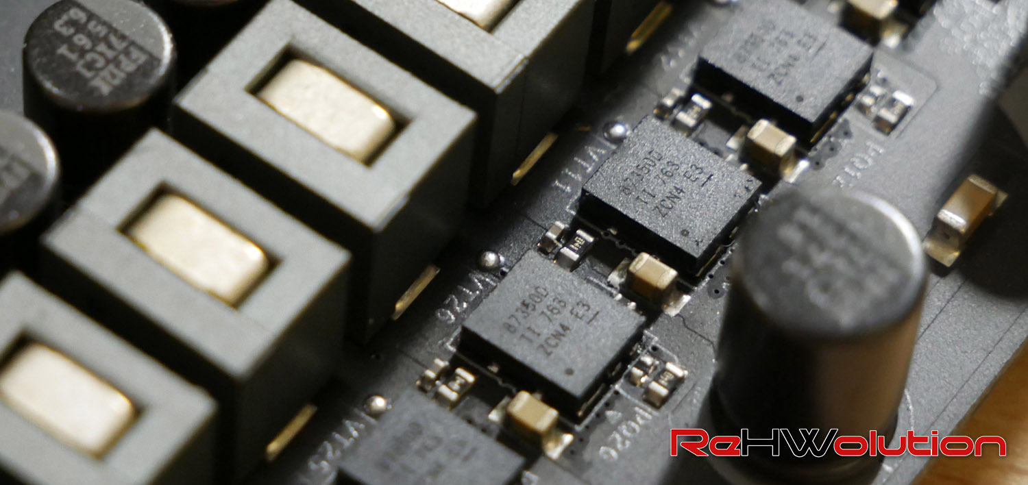 La sezione di alimentazione della ASRock Z390 Phantom Gaming 9 è composta da 12+2 fasi, con la sezione CPU che dispone di 6 fasi Texas Instruments CSD83750 da 40 A raddoppiate (in totale, appunto, 12) tramite chip IR3598 sul retro e 2 fasi Sinopower SM7341EH da 25 A ciascuna per l’iGPU, il tutto controllato da un controller International Rectifier IR35201, in configurazione 6+2; lato RAM, troviamo un UPI uP1674 che controlla due fasi Sinopower SM7341EH, per un totale di 50A per la subsection delle memorie, più che abbastanza anche ad azoto liquido. Vi mostriamo le immagini della Taichi Ultimate, visto che le VRM sono identiche in tutto: