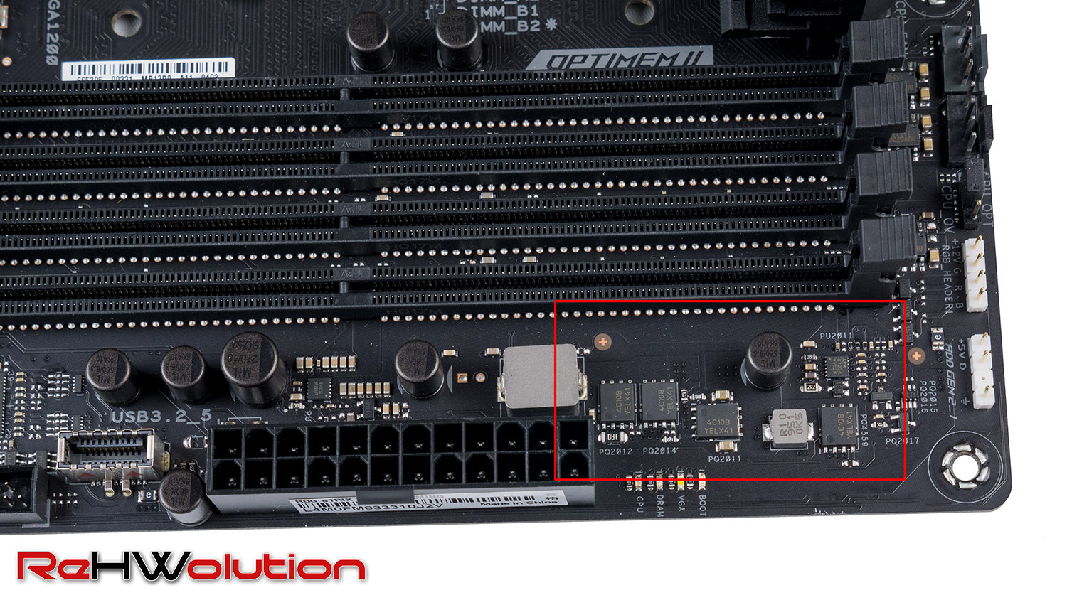 In foto anche la sezione d’alimentazione delle memorie, composta da un controller Anpec APW8723A abbinato a due fasi High+Low Side di OnSemi 4C10B, con un output totale per la sezione RAM di 45 A, più che sufficiente anche per il kit più esigente e veloce.