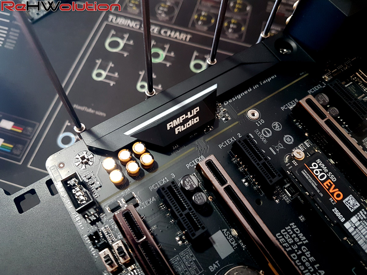 Una delle particolarità è il fatto che a bordo troviamo non uno ma due chip audio ALC1220, con due amplificatori per cuffie (uno per l’audio posteriore ed uno per il pannello frontale) per avere una resa sonora ottimale. Sempre per la sezione audio, sono presenti due porte USB “DAC-UP” con un isolamento dalle interferenze elettromagnetiche migliorato e la possibilità di regolare il voltaggio tramite software, in modo da gestire in modo ottimale le periferiche collegate.