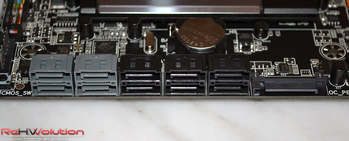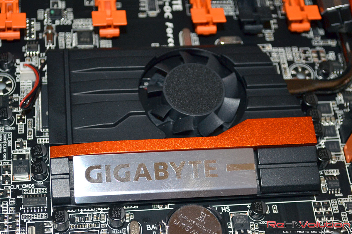 La scheda madre oggi in analisi presenta diverse soluzioni interessanti, tra cui spicca un sistema ibrido di raffreddamento delle fasi, con un voluminoso dissipatore attraversato da heatpipes nella sezione delle fasi ed una ventola da 40 mm ad aiutare lo smaltimento del calore. Anche sul blocco PCH è presente una ventola da 40 mm, che serve a tenere le temperature di esso sotto controllo; il blocco in alluminio è collegato ad un dissipatore situato al centro della scheda madre tramite una heatpipe in rame, aiutando a raffreddare anche il bridge PLX8747, che si occupa di dividere le 16 linee PCI-E 3.0 e “splittarle” in 4 slot PCI-E 16x meccanici e 8x elettrici, consentendo una velocità di connessione maggiore nel caso in cui si installino 2, 3 o 4 schede video rispetto alla Z87X-OC liscia, che consente velocità pari a 8x (3.0), 4x (3.0), 4x (3.0) e 4x (2.0), bloccando inoltre la possibilità di utilizzare il controller Marvell integrato.