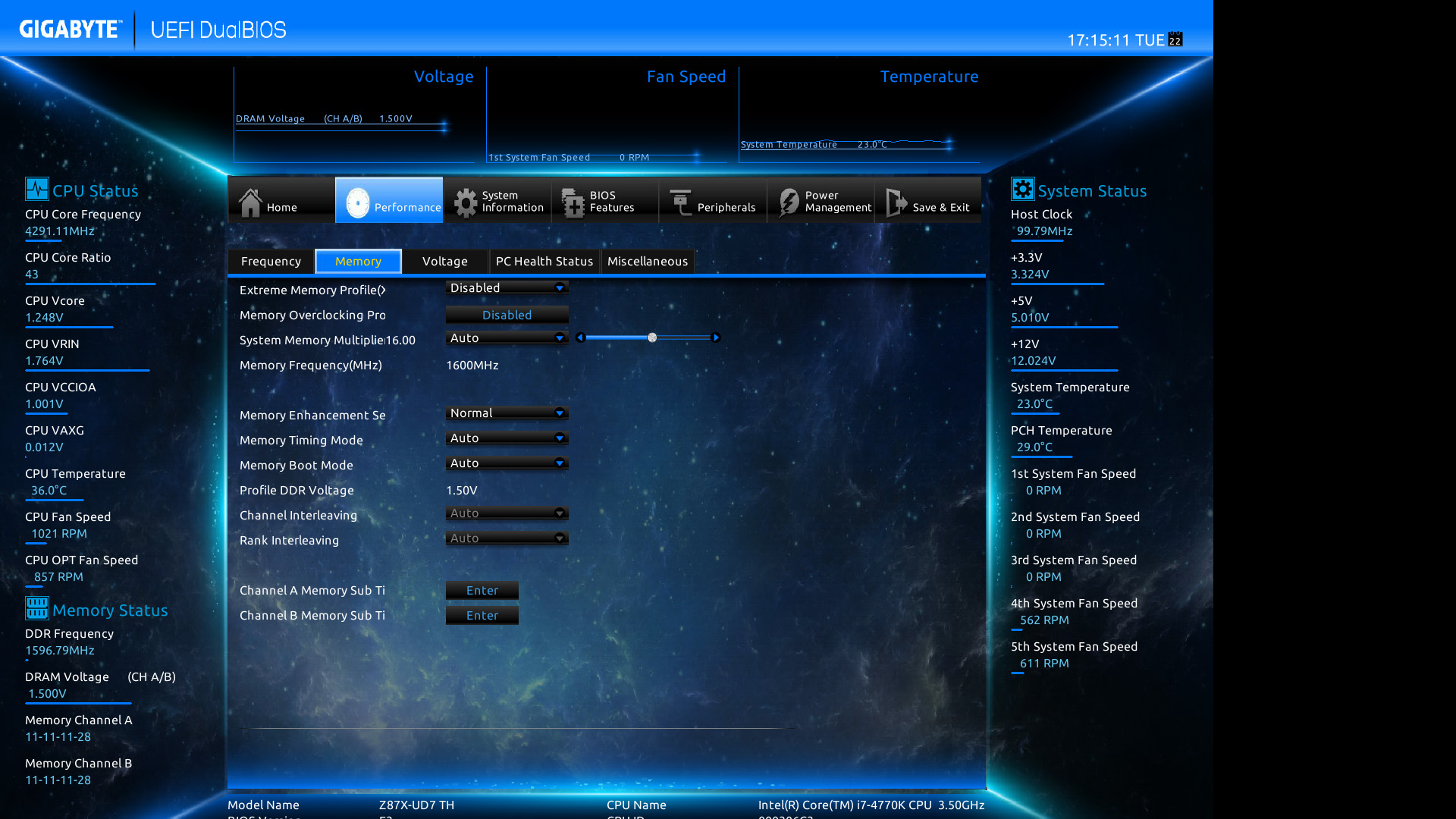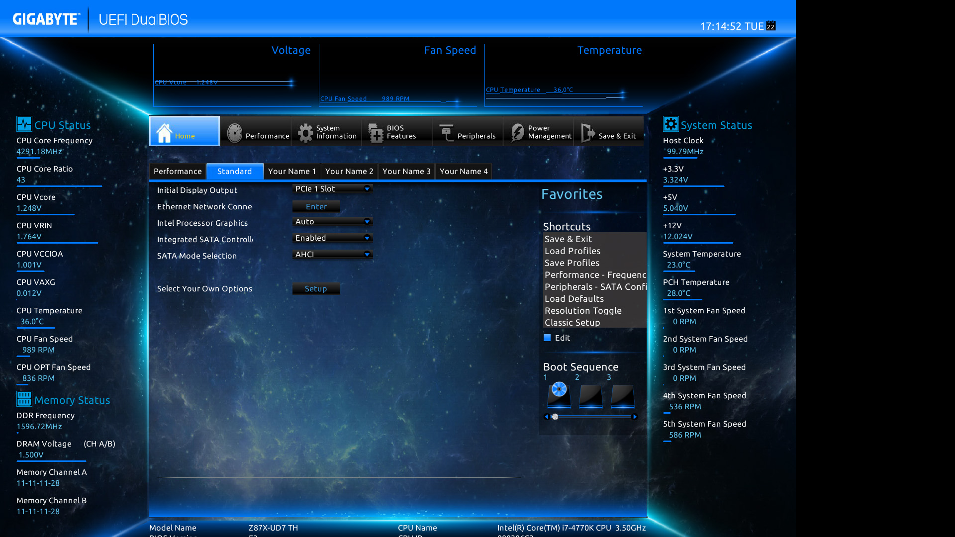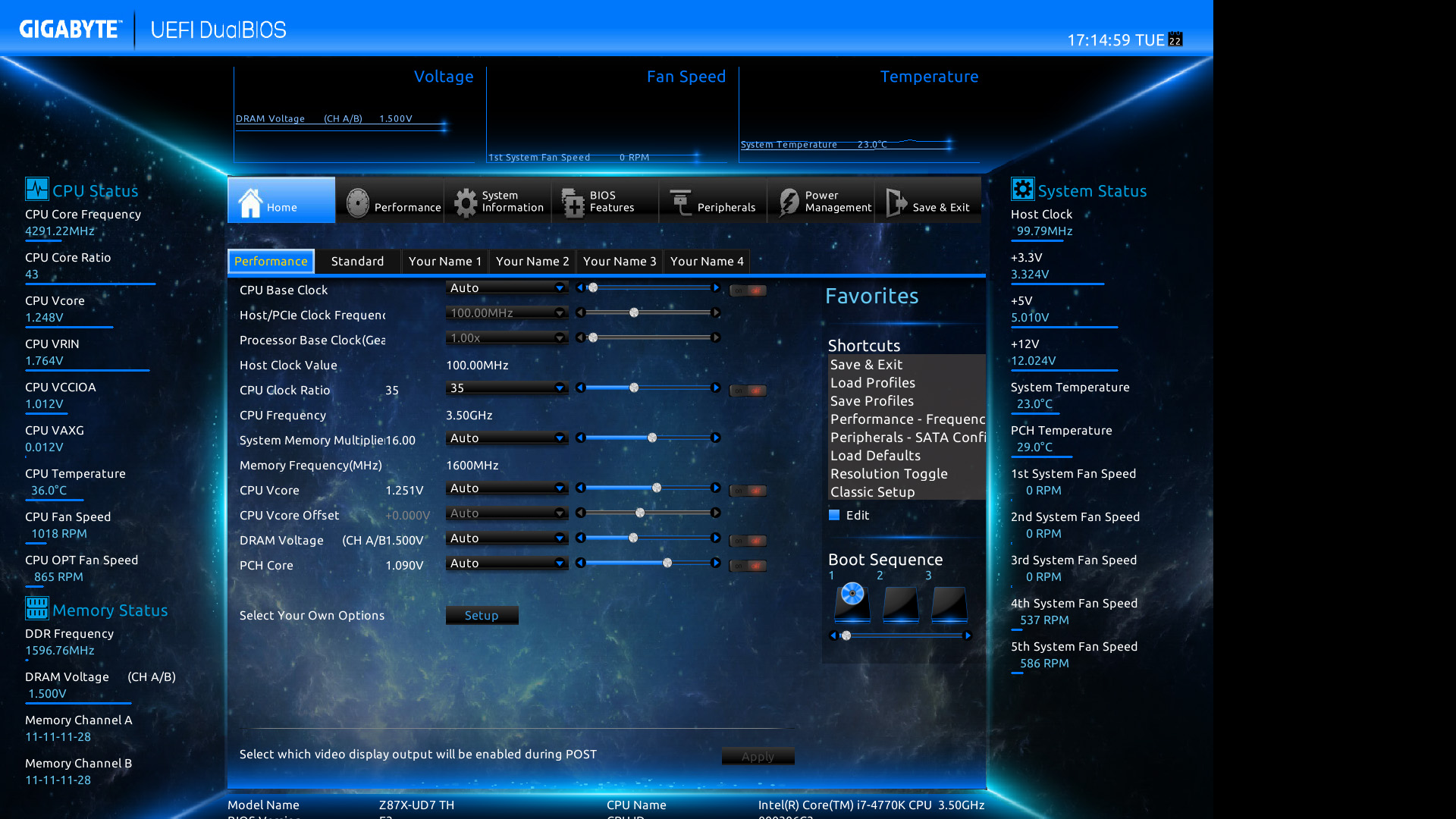 Gigabyte Z87X-UD7 TH: il BIOS–> Di seguito, alcuni screenshot del BIOS della scheda, che si presenta identico a quello della Z87X-OC Force se non per il colore e per le opzioni del controller Thunderbolt:
