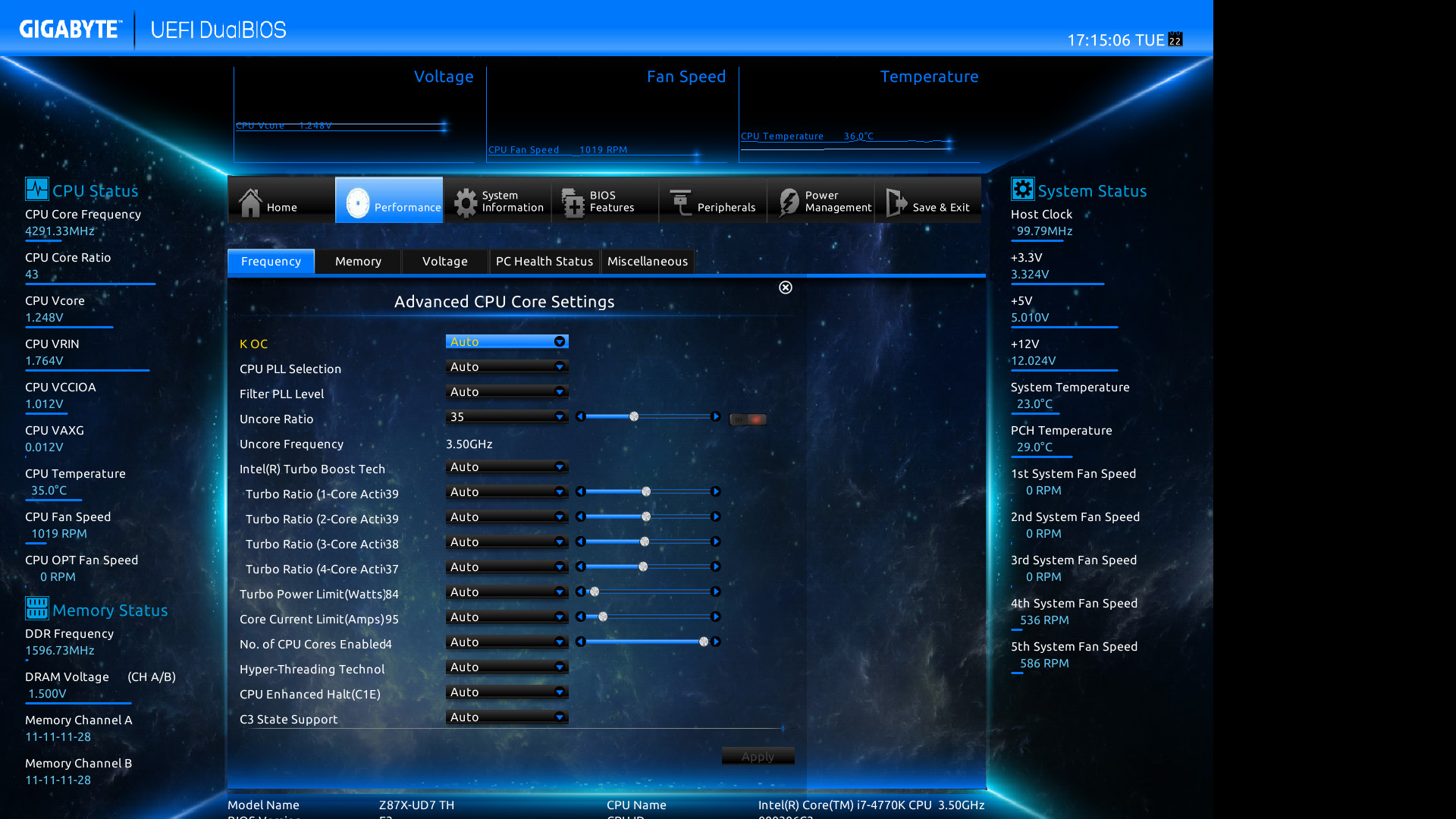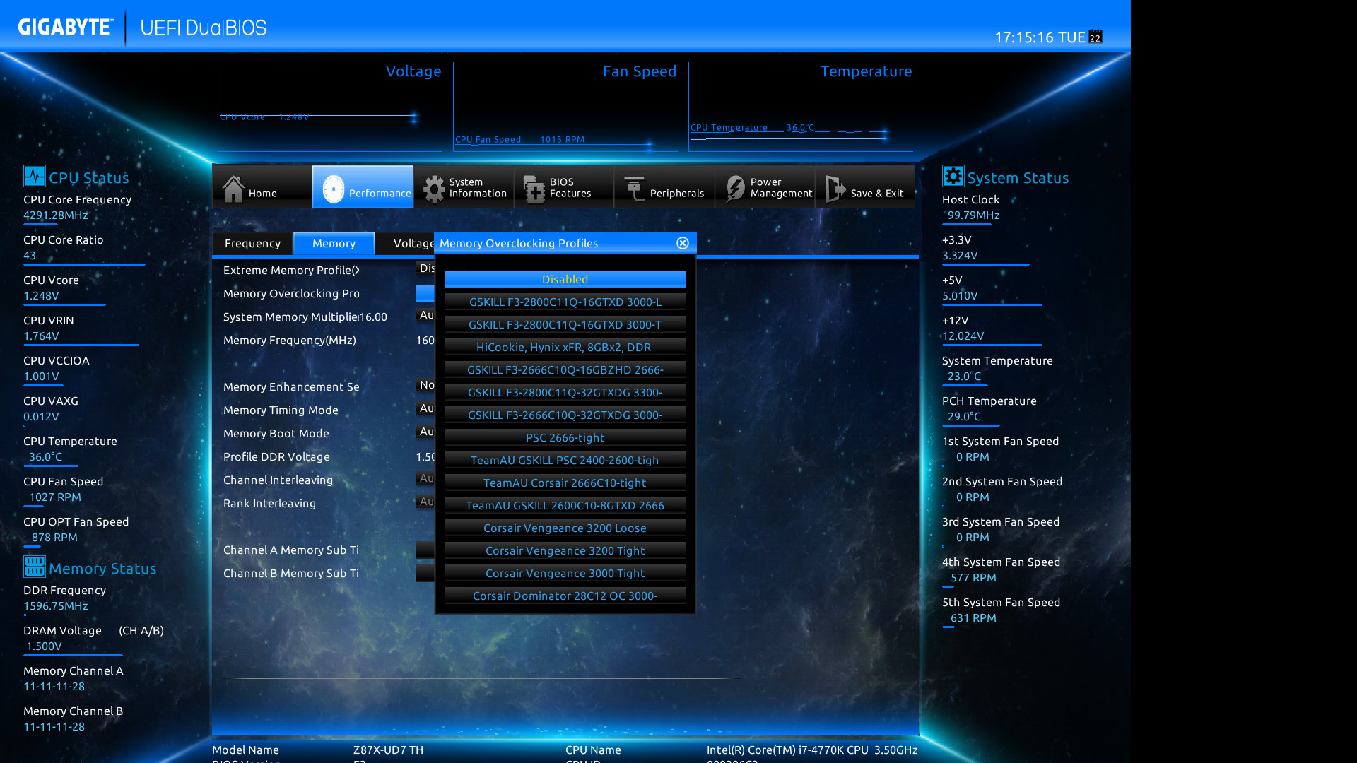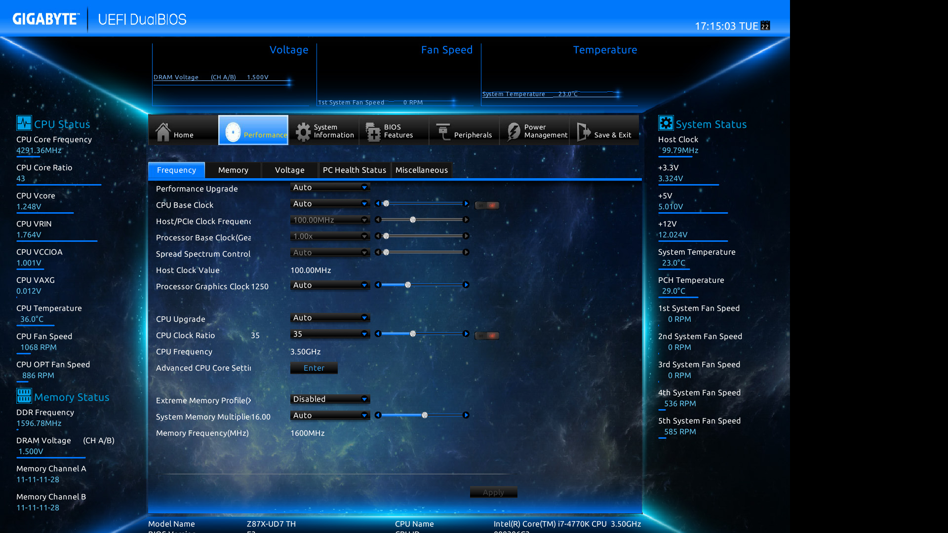 Gigabyte Z87X-UD7 TH: il BIOS–> Di seguito, alcuni screenshot del BIOS della scheda, che si presenta identico a quello della Z87X-OC Force se non per il colore e per le opzioni del controller Thunderbolt:
