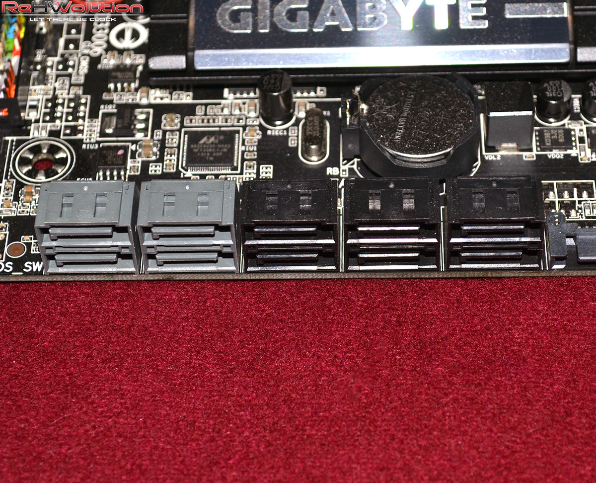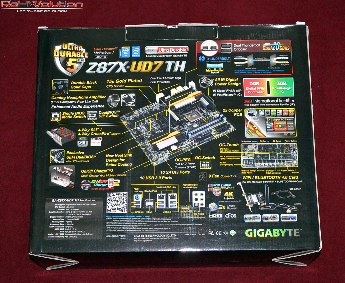 La Gigabyte Z87X-UD7 TH è pressoché identica alla Z87X-OC Force, se non per la presenza di un controller Thunderbolt con relative porte miniDP dedicate. La scheda madre presenta un sistema ibrido di raffreddamento delle fasi, con un voluminoso dissipatore attraversato da heatpipes nella sezione delle fasi ed una ventola da 40 mm ad aiutare lo smaltimento del calore. Anche sul blocco PCH è presente una ventola da 40 mm, che serve a tenere le temperature di esso sotto controllo; il blocco in alluminio è collegato ad un dissipatore situato al centro della scheda madre tramite una heatpipe in rame, aiutando a raffreddare anche il bridge PLX8747, che si occupa di dividere le 16 linee PCI-E 3.0 e “splittarle” in 4 slot PCI-E 16x meccanici e 8x elettrici, consentendo una velocità di connessione maggiore rispetto alle schede madri di fascia inferiore. Questa scheda è dotata di doppio controller Intel Ethernet, con supporto al teaming (per bilanciare il carico di lavoro sui due controller e sulle due porte RJ45), oltre a disporre di una scheda PCI-E 1x con protocolli di connessione Wi-Fi 802.11 b/g/n e Bluetooth 4.0. Sono presenti 10 porte SATA III (6 controllate dal controller Intel e 4 dal controller Marvel 88SE920) con supporto a RAID 0, 1, 5 e 10 per le prime 6 e RAID 0, 1 e 10 per le ultime 4. Completano la dotazione tutta una serie di bridges per sistemi multi-GPU NVIDIA e CrossFireX, con bridge a 2, 3 e 4 vie per sistemi NVIDIA. Il controller Thunderbolt consente di gestire fino a 2 flussi (con Daisy Chain fino a 31 devices per porta) indipendenti l’uno dall’altro.