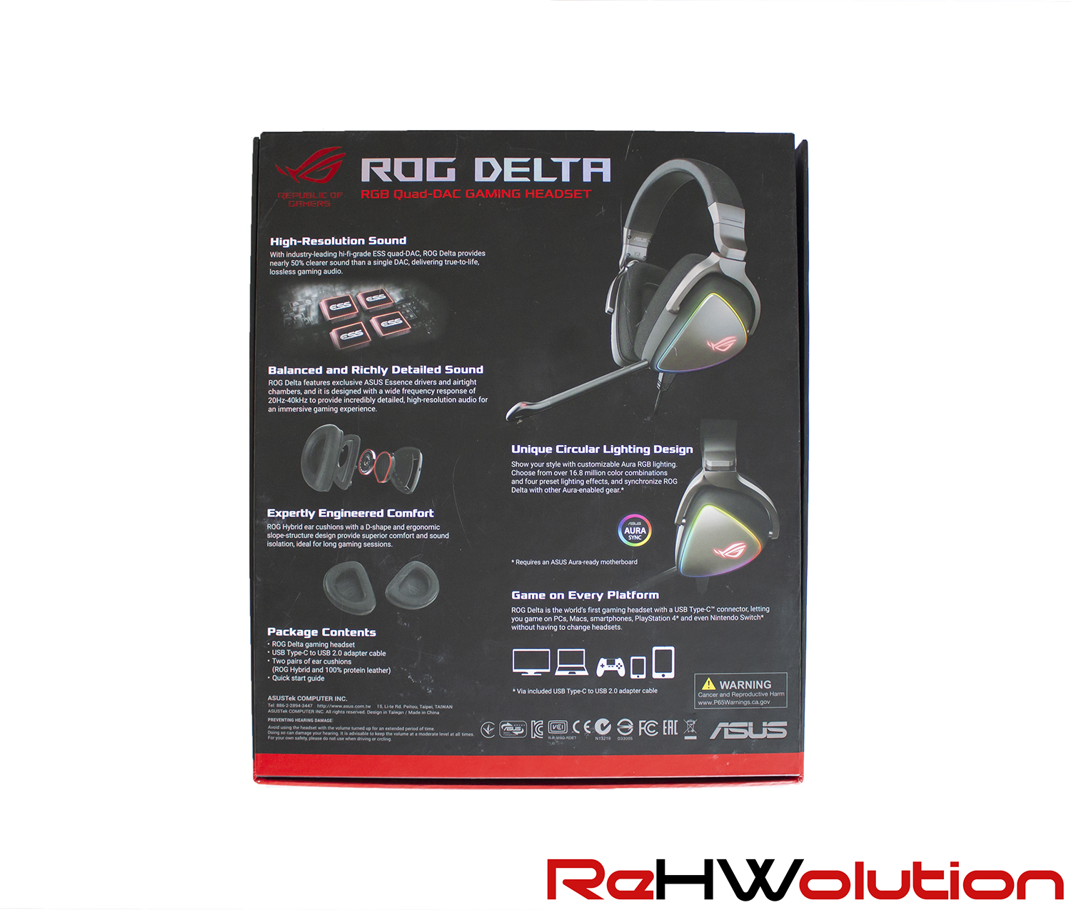 ASUS propone le Delta in una confezione accattivante in pieno stile Republic of Gamers, con la periferica raffigurata al centro e i classici colori sociali che ne fanno da contorno. L’apertura, a scrigno, ci permette di accedere al contenuto interno: notiamo subito un coperchio su cui è presente una scritta argentata che informa l’utente su come le cuffie siano state concepite ascoltando i feedback dei migliori videogiocatori in circolazione. Il bundle è tuttavia tanto povero quanto essenziale: troviamo una coppia di padiglioni in microfibra e in pelle, l’adattatore USB 2.0 Type-C a Type-A e microfono rimovibile con connettore jack da 3.5 mm.