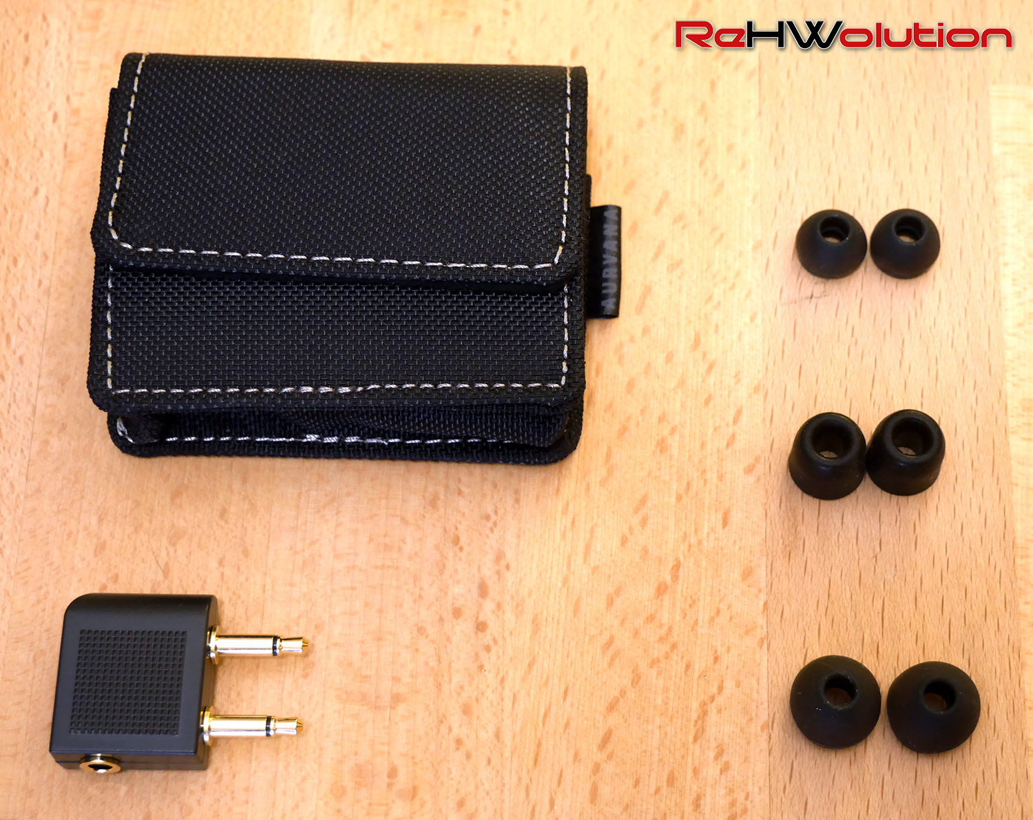 Insieme alle cuffie, nella confezione, troviamo una custodia semi-rigida insieme a 3 set di gommini oltre a quello pre-installato: uno in schiuma e 3 in silicone, in taglie S, M e L.