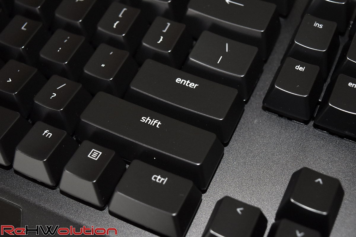 Gli switch utilizzati sono paragonabili ai Cherry MX Blue, tipo di interruttori per tastiere utilizzati raramente per via della loro elevata rumorosità, mentre la forza di attuazione è di 50 gr, valore pressoché identico tra i vari tipi di switch in commercio.