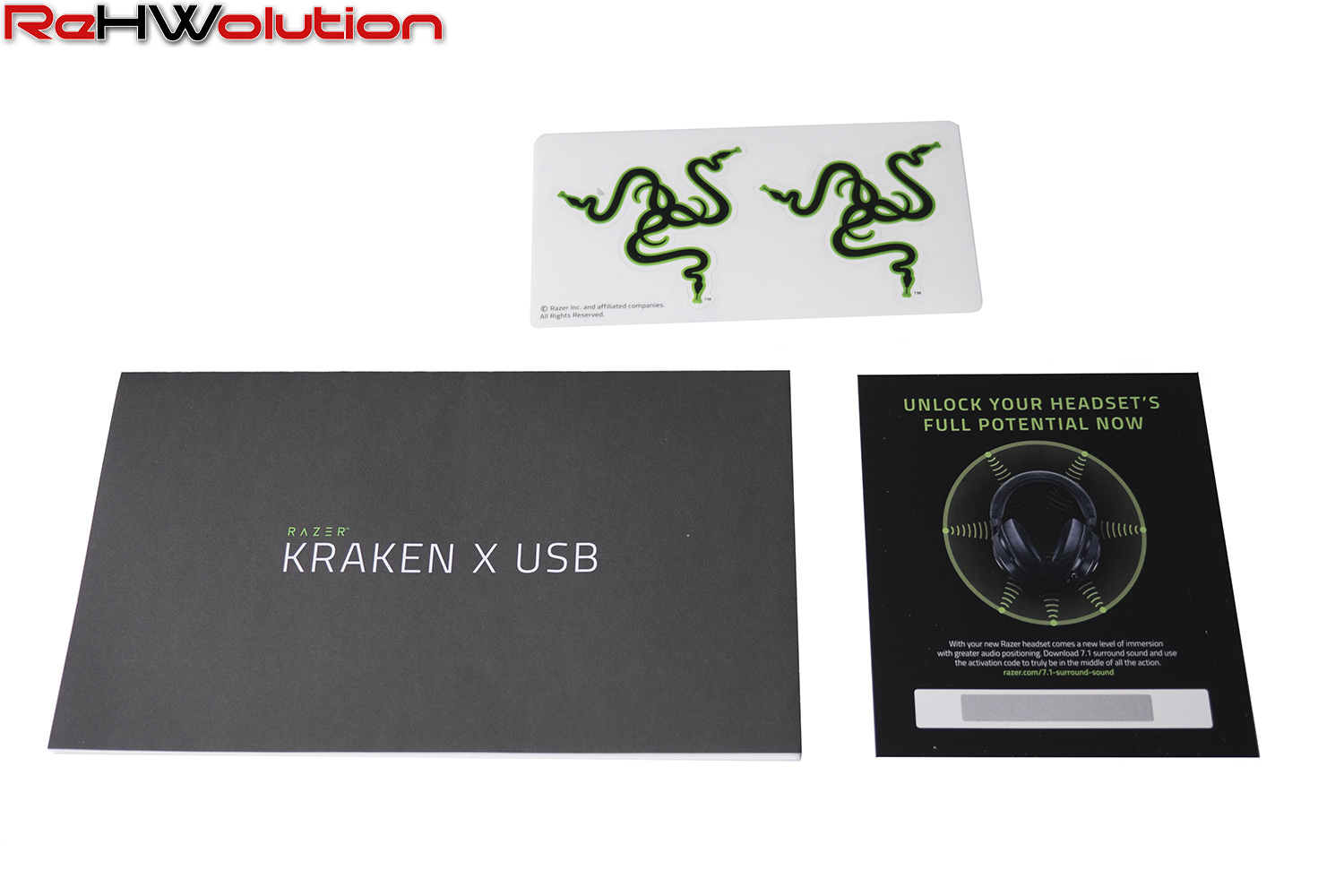 Con un bundle particolarmente scarno, le Razer Kraken X USB sono un headset di fascia media di dimensioni compatte e che utilizzano, come il nome lascia intendere, una connessione USB per collegarsi al PC. In dotazione, due stickers, un manuale di prima installazione ed il voucher con il codice per attivare il software per il Virtual Surround 7.1.