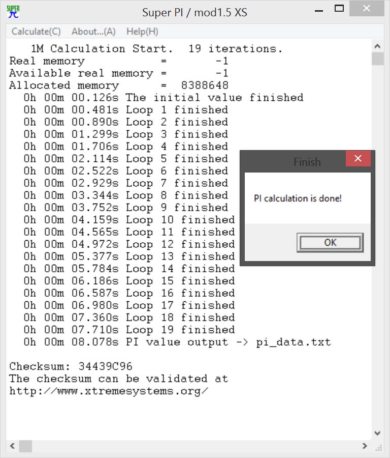 Un metodo tradizionale per verificare le prestazioni del proprio PC è utilizzare SuperPI mod 1.5 XS: il programma si occupa di calcolare dalle 16k ai 32m di cifre dopo la virgola del π, con una scalabilità clock per clock davvero sorprendente per un programma creato nel 1995. Il programma calcola l’efficienza single-threaded piuttosto che quella multithreaded: