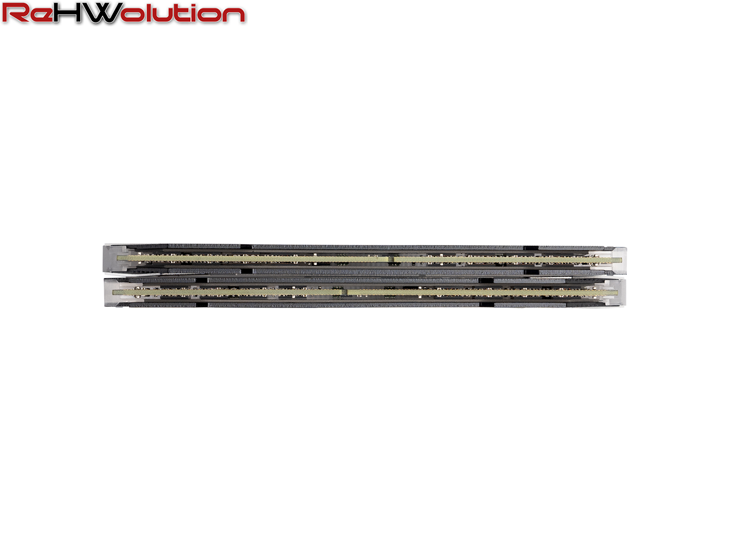 Da notare la configurazione dual rank/dual side dei moduli, con 16 chip per ogni DIMM suddivisi in gruppi da 8 banks.
