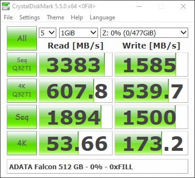 Come forse già saprete, AS SSD Benchmark è un test più impegnativo dei due bench precedenti, e lo si nota dal fatto che in nessuna riga (tranne con file da 4KB in scrittura) vengano rispettati gli standard prestazionali pubblicizzati da ADATA. Con un punteggio migliore soltanto dell’unico SSD SATA finora recensito con la nuova piattaforma, infatti, l’ADATA Falcon non sembra brillare tantissimo in questo benchmark. È anche vero, però, che l’azienda nel datasheet dell’SSD riporta i valori riscontrati anche con AS SSD (2800/1100 MB/s), e che essi sono comunque superati dal nostro SSD in prova, ad avvalorare l’ipotesi che le specifiche dichiarate siano state registrate su una piattaforma di last gen.