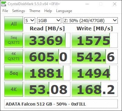 Abbiamo poi proceduto a riempire il drive al 50%, in modo da testare l’SSD in uno scenario più vicino all’utilizzo reale, e abbiamo ripetuto tutta la nostra suite di test:
