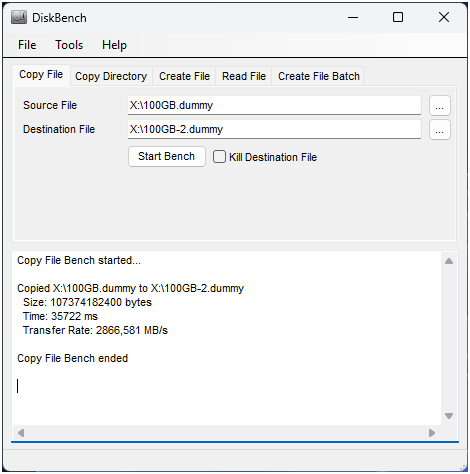 DiskBench è un’utility sviluppata da NodeSoft che consente di misurare le velocità di lettura e scrittura delle unità di archiviazione. Nel nostro test registriamo la velocità media di copia di un file personalizzato da 100 GB, permettendo anche di rilevare eventuali fenomeni di saturazione della cache SLC nei drive che ne sono dotati.