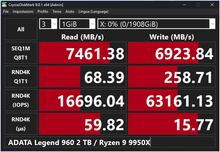 Con CrystalDiskMark 9, l’ADATA Legend 960 da 2 TB conferma la propria natura di SSD PCIe 4.0 con risultati in linea con le migliori unità della stessa generazione. Raggiunge 7461 MB/s in lettura sequenziale e 6924 MB/s in scrittura, collocandosi poco sopra modelli come il Crucial P310 (7216 / 6380 MB/s) e il Kingston Fury Renegade da 1 TB (7334 / 6135 MB/s).