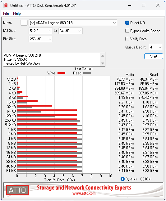 In ATTO, che misura le prestazioni in funzione della dimensione del blocco trasferito, l’ADATA Legend 960 da 2 TB conferma l’ottimo comportamento tipico delle unità PCIe 4.0, pur restando dietro ai modelli PCIe 5.0 più recenti.