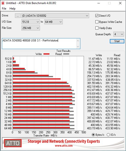 Le velocità dichiarate dal produttore di 440MB/s in lettura e 430MB/s in scrittura sono da ritenersi corrette per il drive nella sua capienza massima, da 960 GB. Questo qui da 480 GB si ferma a “soli” 437MB/s in lettura e 418 MB/s in scrittura, che sono più o meno equivalenti a quanto dichiarato per il drive di capacità maggiore. Un bel risultato, considerando che si tratta a conti fatti di un SSD SATA con la circuiteria di conversione per USB 3.1.