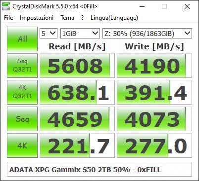 Abbiamo poi proceduto a riempire il drive al 50%, in modo da testare l’SSD in uno scenario più vicino all’utilizzo reale, e abbiamo ripetuto tutta la nostra suite di test: