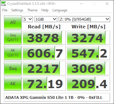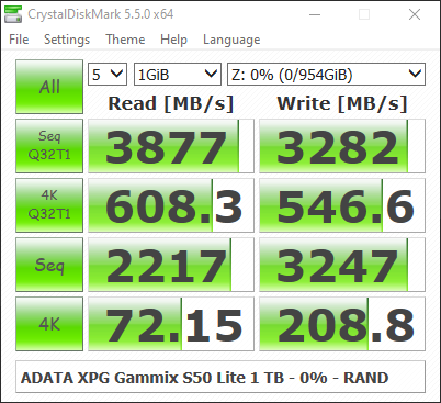 Con test più impegnativi, AS SSD rileva velocità di circa 3400 MB/s in lettura e 3000 MB/s in scrittura, comportandosi discretamente anche nei test di compressione e copia. Ancora una volta i valori sequenziali rispecchiano quanto dichiarato da ADATA, sebbene i punteggi finali non siano particolarmente elevati.