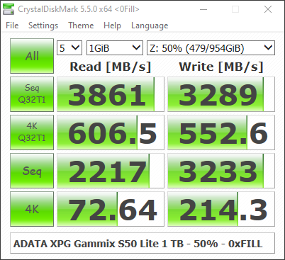 Abbiamo poi proceduto a riempire il drive al 50%, in modo da testare l’SSD in uno scenario più vicino all’utilizzo reale, e abbiamo ripetuto tutta la nostra suite di test: