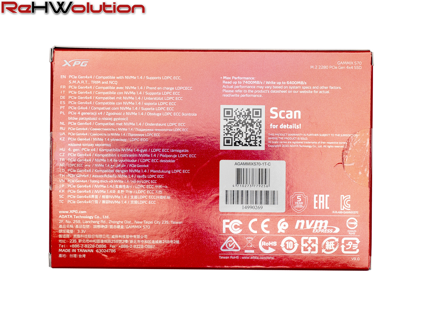 Sul retro, invece, troviamo le prestazioni massime del drive (anche se non sono specifiche alla versione da 1 TB ma all’SSD in generale) e le stesse informazioni che troviamo sulla parte frontale ma in più lingue. È presente inoltre un QR code da scansionare col cellulare per accedere alla product page dell’SSD.