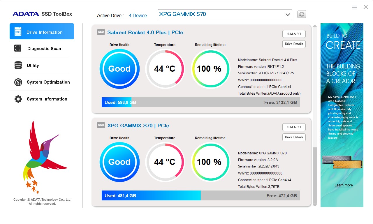 - Controllare la vita rimanente, la temperatura e lo stato S.M.A.R.T. di tutti gli SSD installati (non solo quelli ADATA)