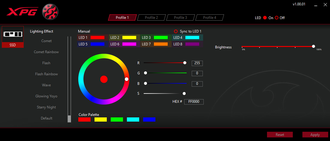Il software XPG RGB, invece, permette di personalizzare le modalità di illuminazione RGB, ed è basato sullo stesso software che permette di gestire anche le memorie G.Skill, tra l’altro. È possibile salvare i settings in 4 profili, in modo da mantenere impostazioni diverse e richiamarle con un paio di click.