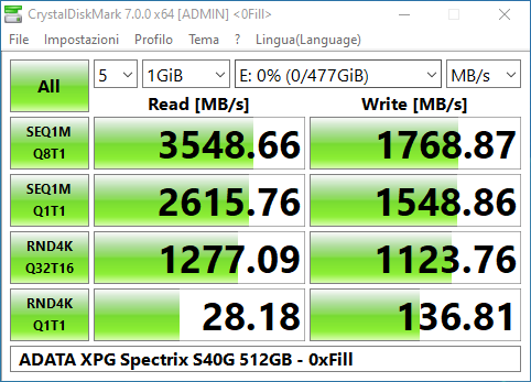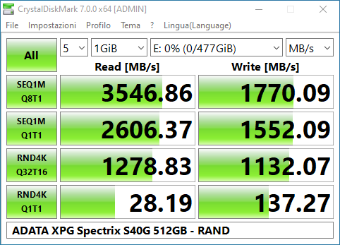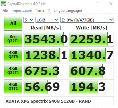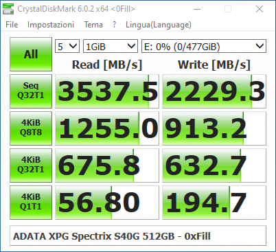 Situazione un po’ più rilassata utilizzando CrystalDiskMark 6.0.2, che consente di raggiungere per filo e per segno i valori di lettura e scrittura dichiarati da ADATA: 3500 e 2250 MB/s rispettivamente.