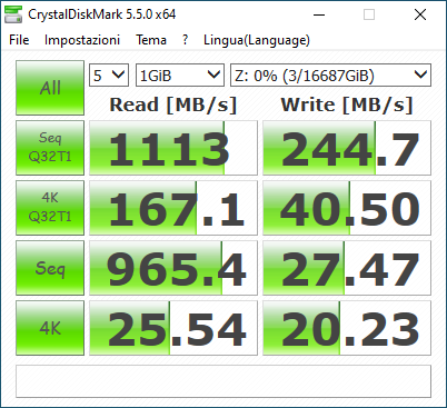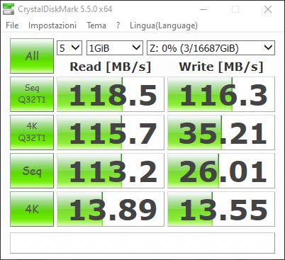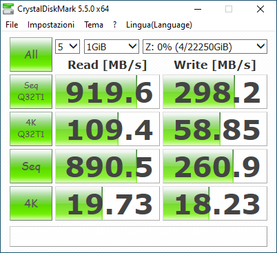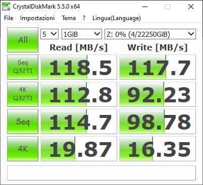 Per testare le prestazioni, abbiamo fatto affidamento su CrystalDiskMark, che nella versione 5.5.0 sembra essere rimasto l’ultimo benchmark contemporaneamente affidabile e compatibile con Windows 10.