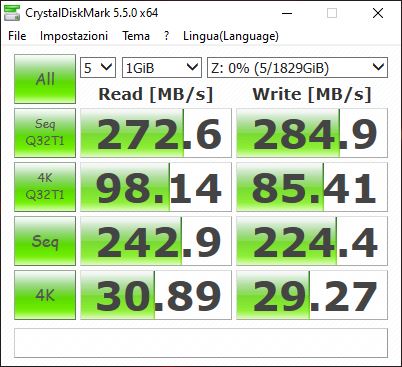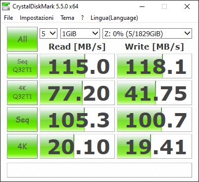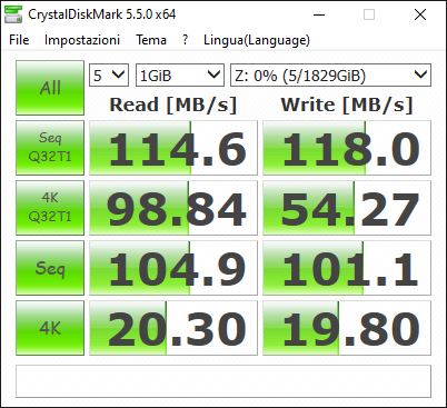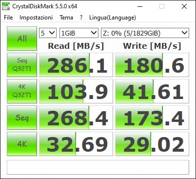 Per testare le prestazioni, abbiamo fatto affidamento su CrystalDiskMark, che nella versione 5.5.0 sembra essere rimasto l’ultimo benchmark contemporaneamente affidabile e compatibile con Windows 10.