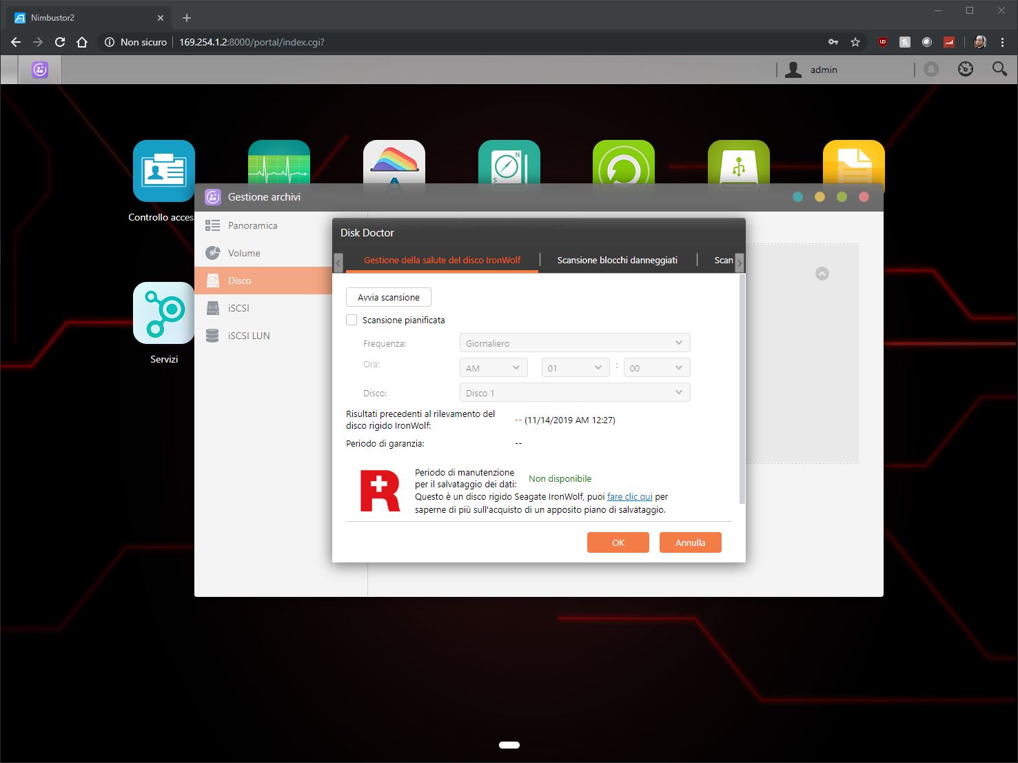 In seguito, abbiamo utilizzato una coppia di dischi Seagate Ironwolf Pro da 2TB ciascuno (ST2000NE0025), con il NAS che riporta ancora una volta una serie di informazioni vitali. Questi dischi hanno una velocità di rotazione di 7200 RPM e velocità di lettura e scrittura di 195 MB/s.