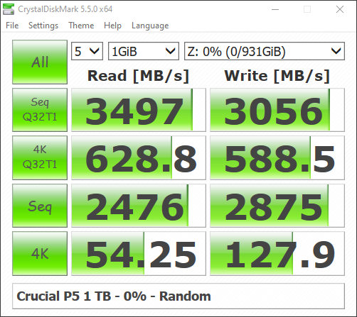 Con Crystal Disk Mark, il Crucial P5 raggiunge ben oltre le specifiche dichiarate di 3400/3000, con quasi 3500 MB/s in lettura e oltre 3050 MB/s in scrittura, valori decisamente impressionanti visto che si tratta praticamente del limite fisico (almeno in lettura) per lo standard PCIe 3.0. Ottime le prestazioni con file da 4 KB, in linea con le soluzioni concorrenti. Il controller sembra avere prestazioni identiche con file comprimibili, il che significa che si avrà sempre lo stesso livello di prestazioni a prescindere dal tipo di file utilizzato.