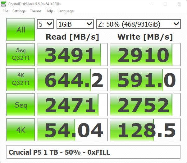 Visto che il punteggio della suite di Anvil dipende molto dalle prestazioni con file di piccole dimensioni, i drive più grandi (2/4 TB) sono parecchio avvantaggiati in questo benchmark. C’è da dire, comunque, che le prestazioni registrate dal Crucial P5 sono le migliori rilevate su drive 3.0 da 1 TB, superato soltanto dai drive da 2 e 4 TB. L’unico drive da 1 TB più veloce è il Gammix S50 Lite, che però utilizza lo standard PCIe 4.0.