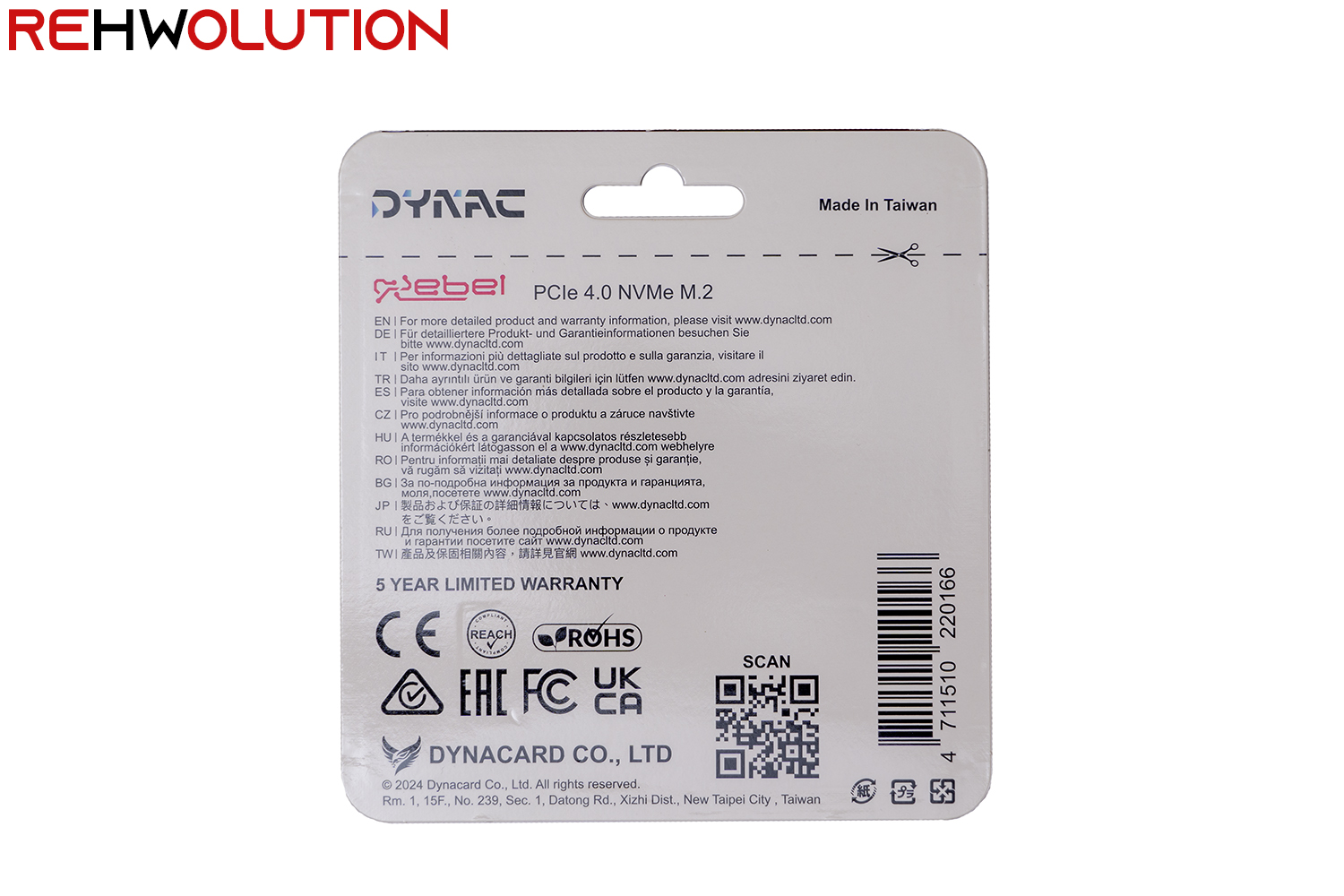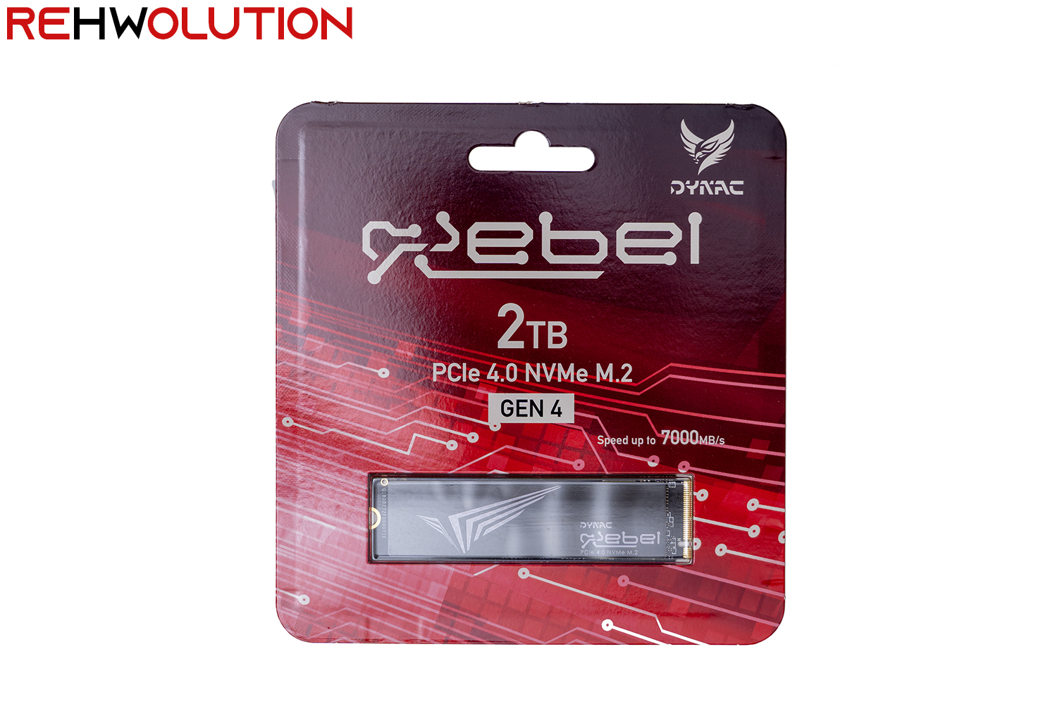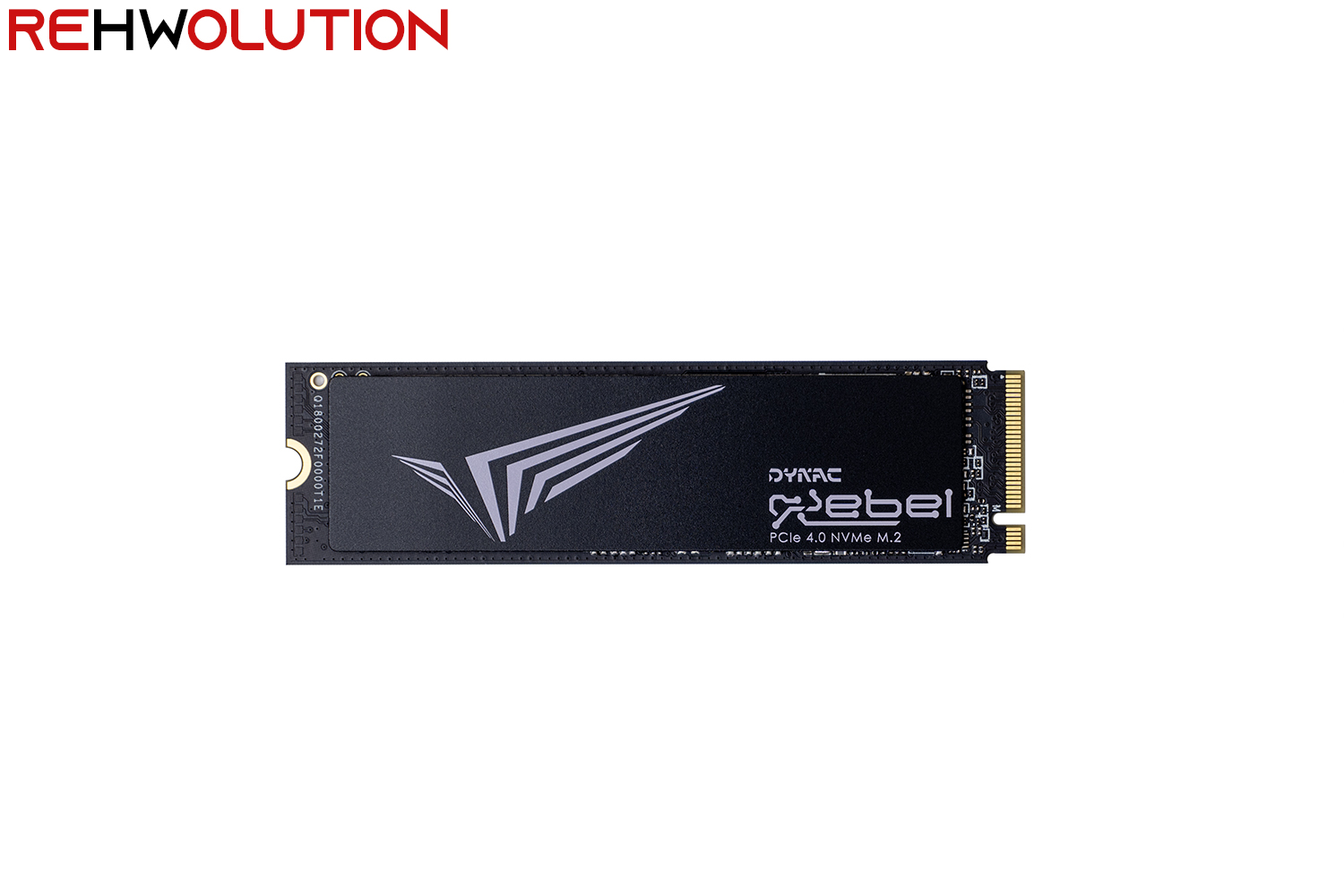 Il Dynac Rebel da 2 TB presenta il classico form factor M.2 2280, ovvero 22 millimetri di larghezza per 80 millimetri di lunghezza, con una configurazione single-sided (ovvero con tutte le componenti su un solo lato del PCB) e dispone di uno spesso sticker in alluminio che funge anche da heatspreader, uniformando il calore generato dalle singole componenti e rendendo più facile la dissipazione tramite eventuali thermal shield di schede madri.