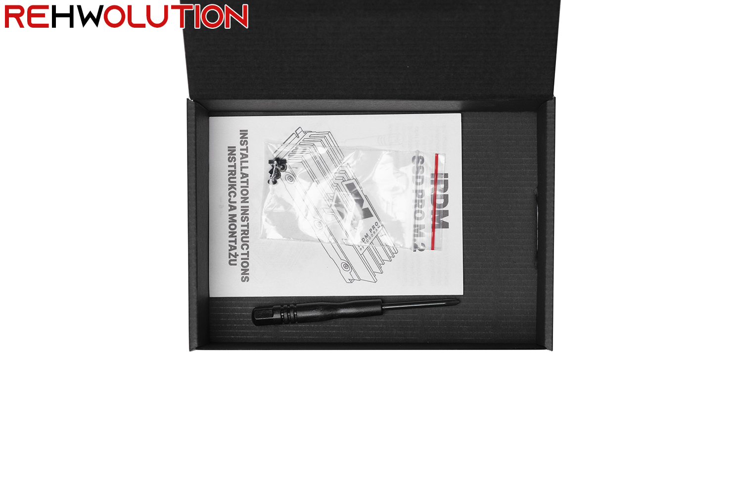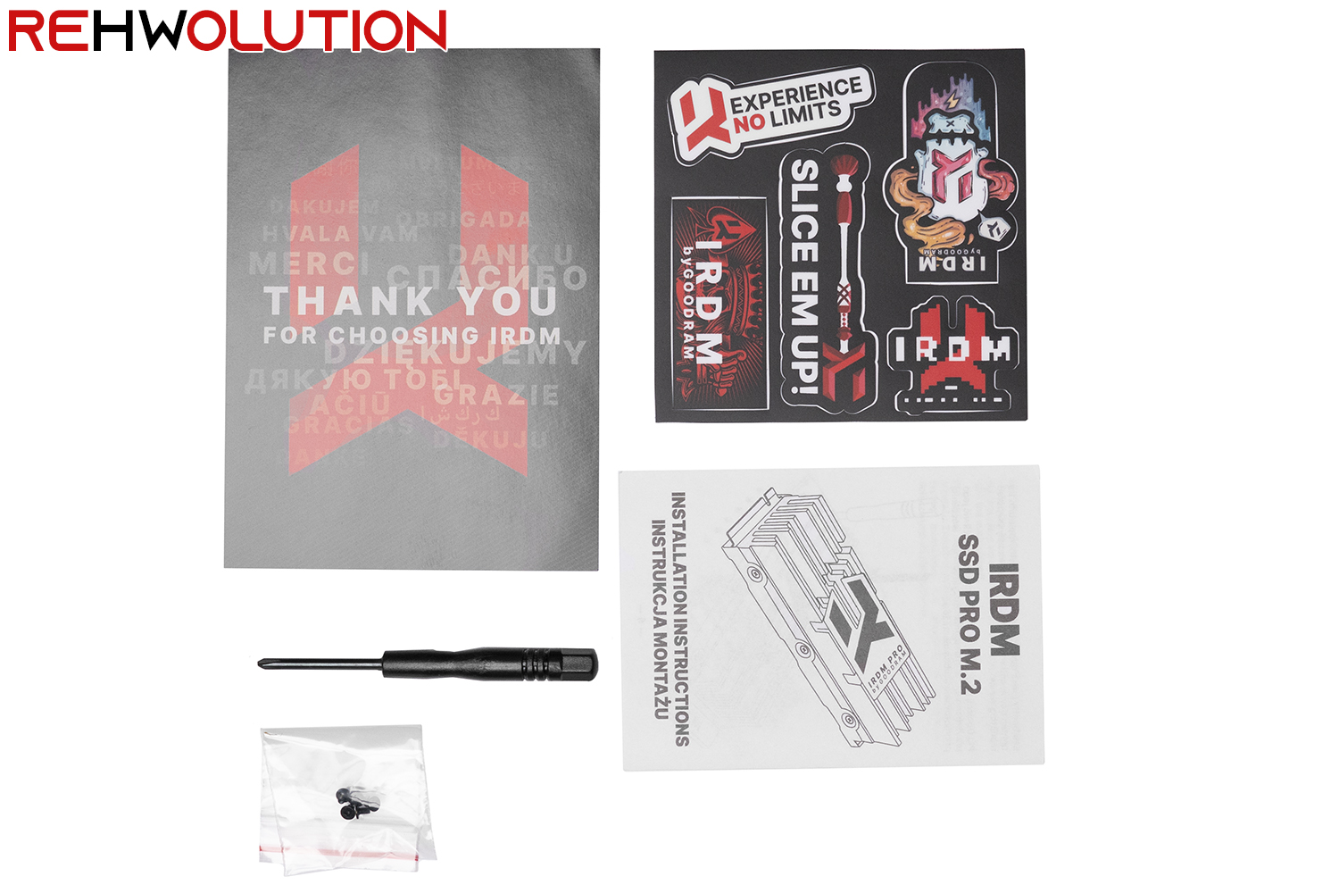 Il bundle è composto da una serie di adesivi, una card di ringraziamenti in varie lingue, un manuale di installazione, un piccolo giraviti PH1 e 6 viti per il montaggio del dissipatore sull’SSD.