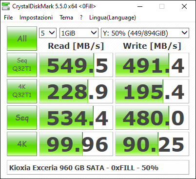 Abbiamo poi proceduto a riempire il drive al 50%, in modo da testare l’SSD in uno scenario più vicino all’utilizzo reale, e abbiamo ripetuto tutta la nostra suite di test: