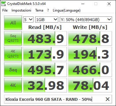 Anche con CDM 5.5.0 non notiamo cali di prestazione, e l’unica differenza visibile è con i file 4KB in scrittura, con una deviazione di 5 MB/s rispetto al valore rilevato col drive vuoto. Si tratta di oscillazioni che non pregiudicano il livello di prestazioni dell’SSD.
