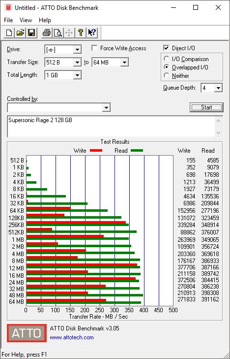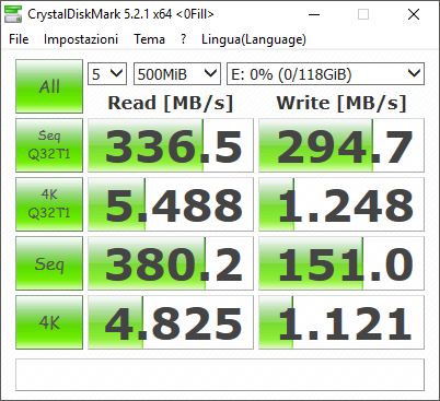 Per verificare che le velocità di lettura e scrittura siano compatibili con quanto dichiarato, ci avvaliamo di due benchmark, ATTO Disk Benchmark (benchmark sintetico che mostra i valori massimi teorici di lettura e scrittura) e CrystalDiskMark (benchmark sintetico che è paragonabile ad un utilizzo ordinario del flashdrive):